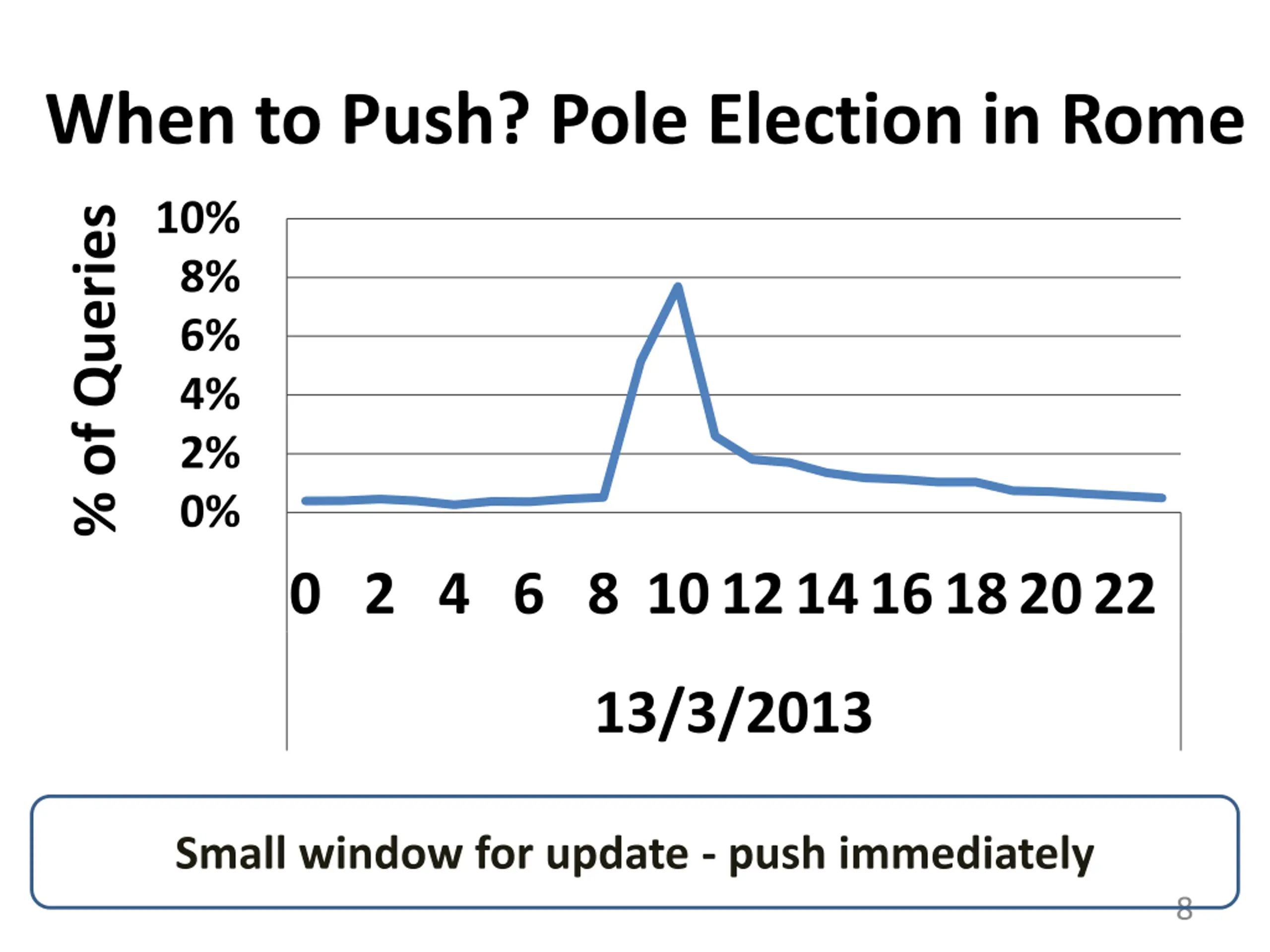 When to Push? Pole Election in Rome 10% % of Queries 8% 6% 4% 2% 0% 0 2 4 6 8 10121416182022 13/3/2013 Small window for update - push immediately 8