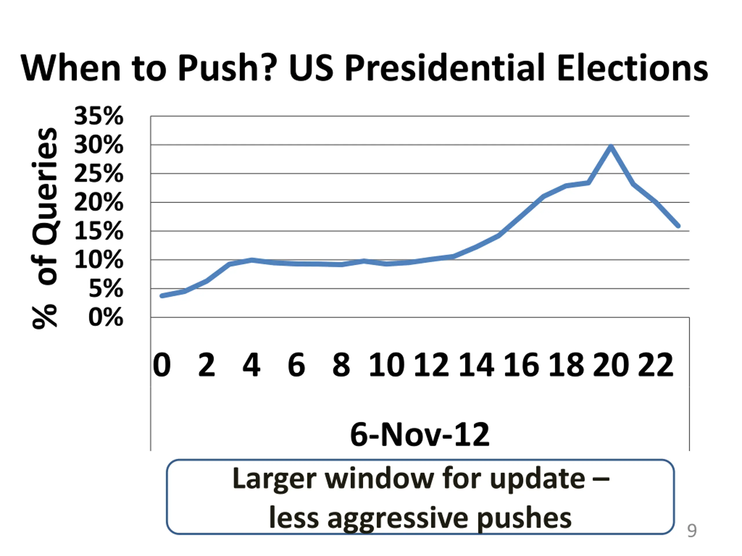 When to Push? US Presidential Elections 35% % of Queries 30% 25% 20% 15% 10% 5% 0% 0 2 4 6 8 10121416182022 6-Nov-12 Larger window for update less aggressive pushes 9