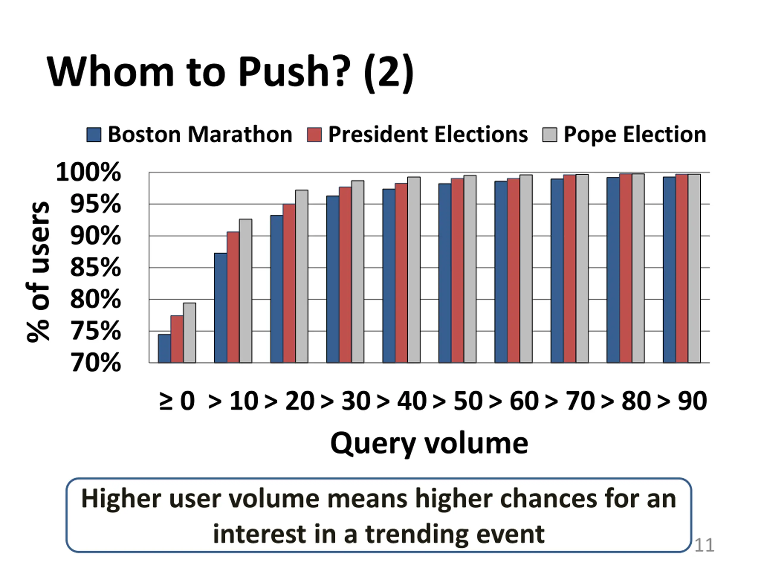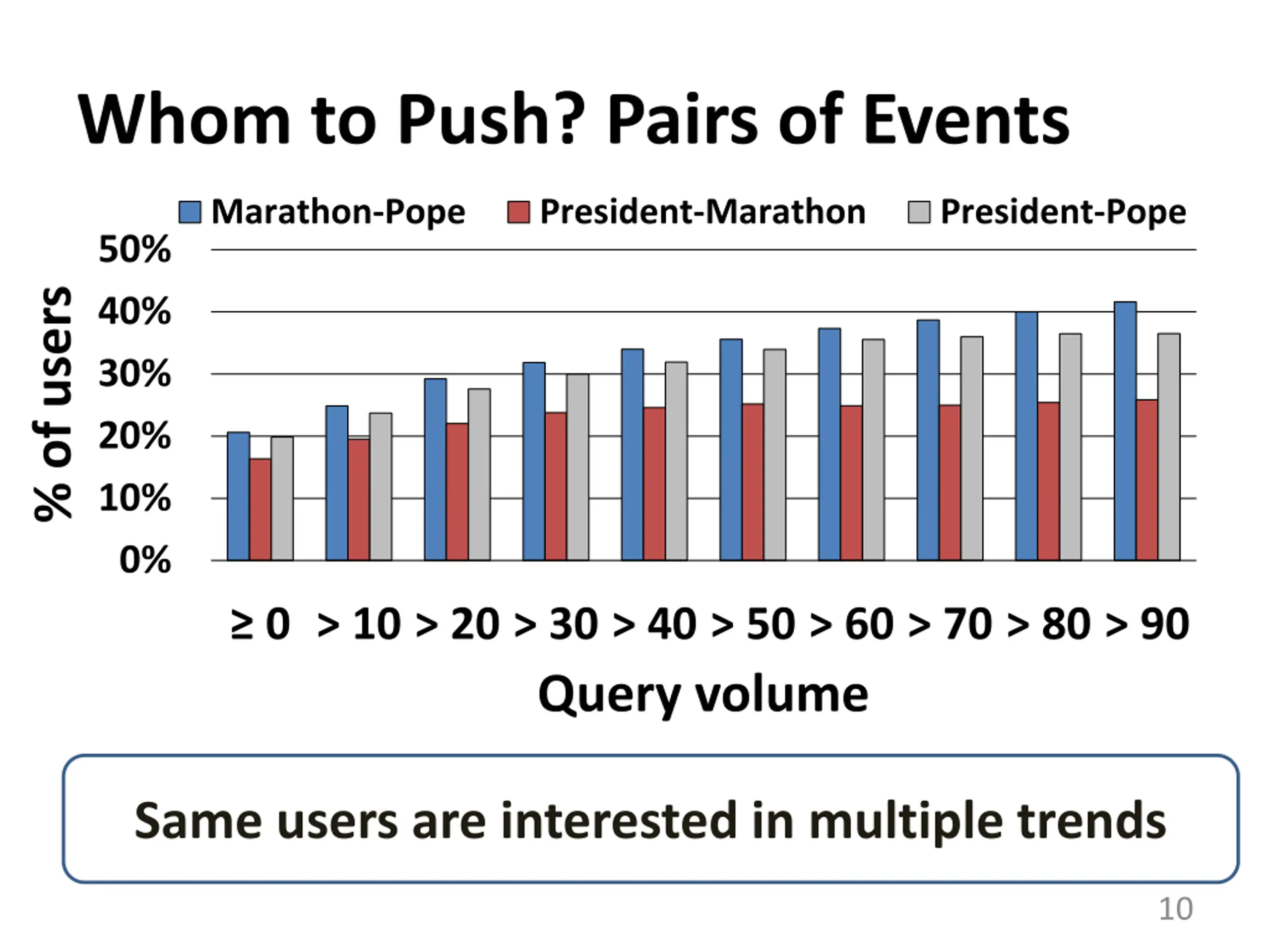 Whom to Push? Pairs of Events Marathon-Pope President-Marathon President-Pope 50% % of users 40% 30% 20% 10% 0% 0 > 10 > 20 > 30 > 40 > 50 > 60 > 70 > 80 > 90 Query volume Same users are interested in multiple trends 10