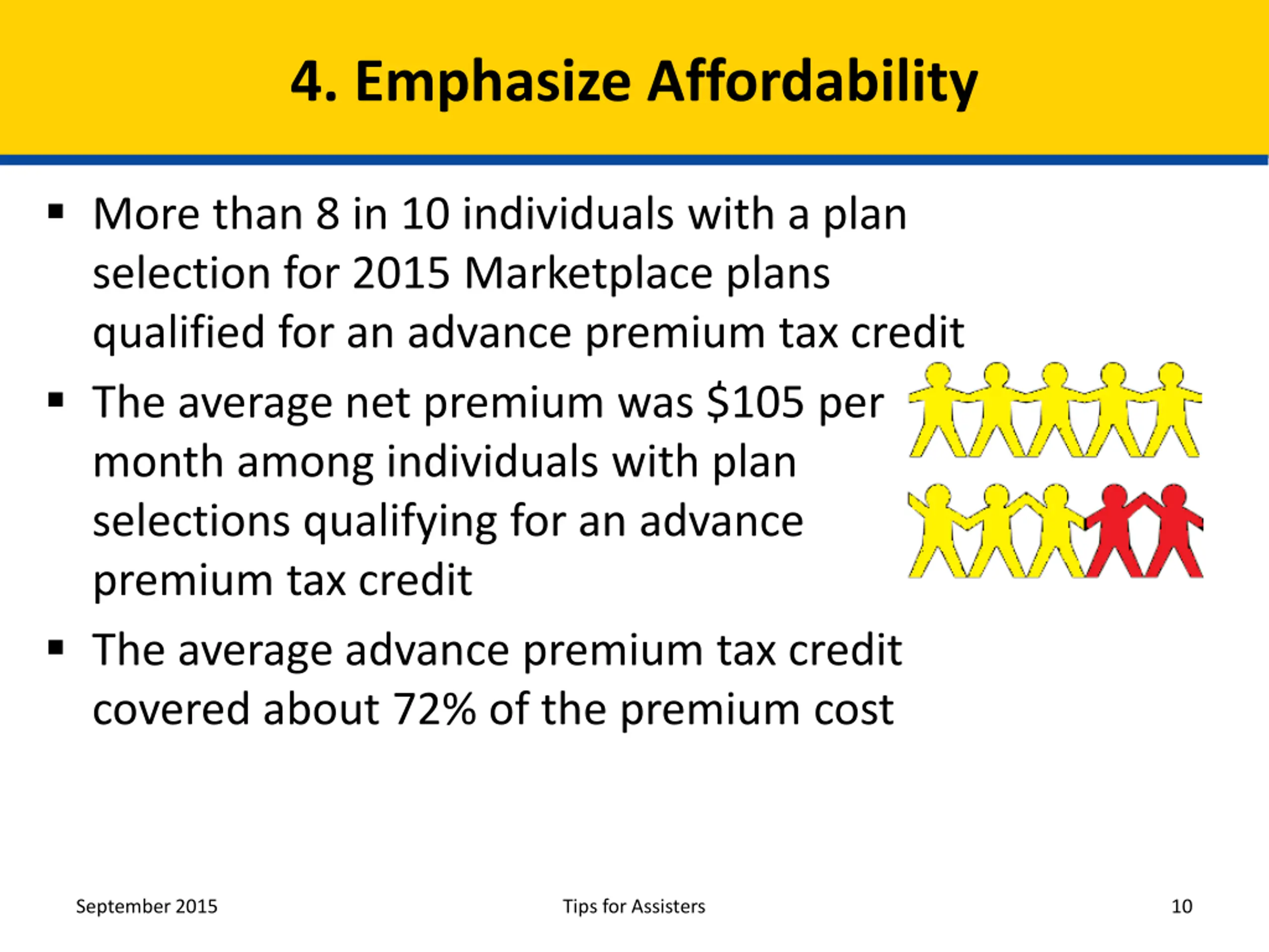 4. Emphasize Affordability More than 8 in 10 individuals with a plan selection for 2015 Marketplace plans qualified for an advance premium tax credit The average net premium was $105 per month among individuals with plan selections qualifying for an advance premium tax credit The average advance premium tax credit covered about 72% of the premium cost September 2015 Tips for Assisters 10