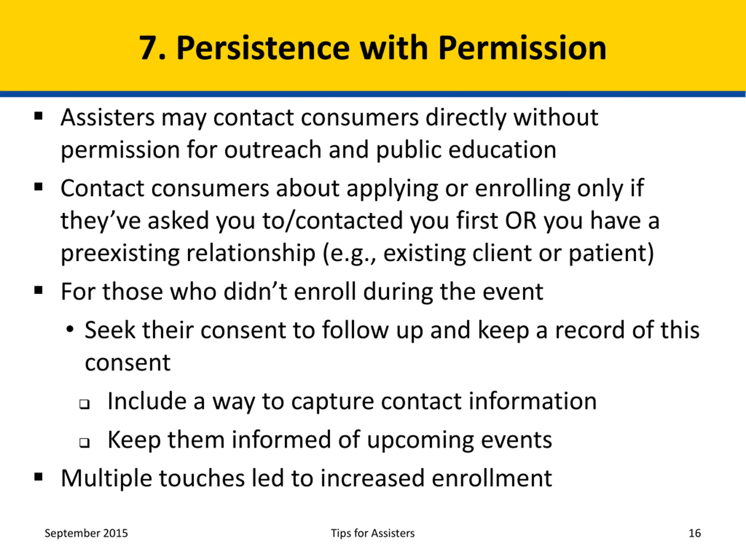7. Persistence with Permission Assisters may contact consumers directly without permission for outreach and public education Contact consumers about applying or enrolling only if they ve asked you to/contacted you first OR you have a preexisting relationship (e.g., existing client or patient) For those who didn t enroll during the event Seek their consent to follow up and keep a record of this consent Include a way to capture contact information Keep them informed of upcoming events Multiple touches led to increased enrollment September 2015 Tips for Assisters 16