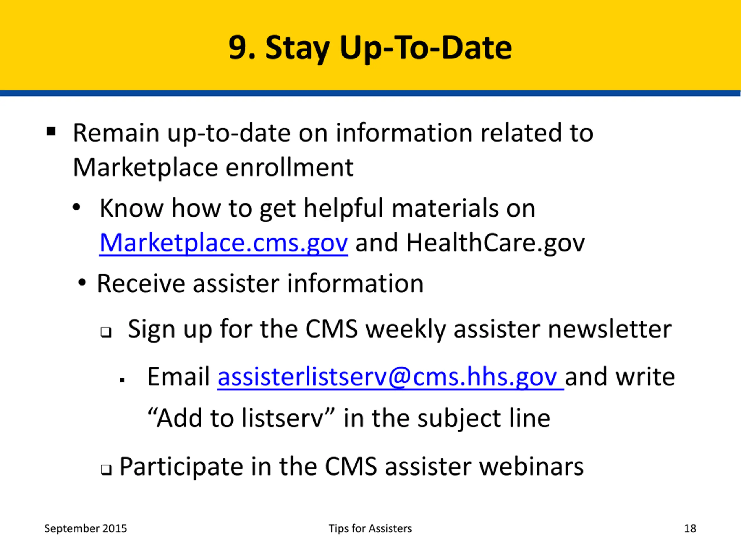 9. Stay Up-To-Date Remain up-to-date on information related to Marketplace enrollment Know how to get helpful materials on Marketplace.cms.gov and HealthCare.gov Receive assister information Sign up for the CMS weekly assister newsletter Email assisterlistserv@cms.hhs.gov and write Add to listserv in the subject line Participate in the CMS assister webinars September 2015 Tips for Assisters 18