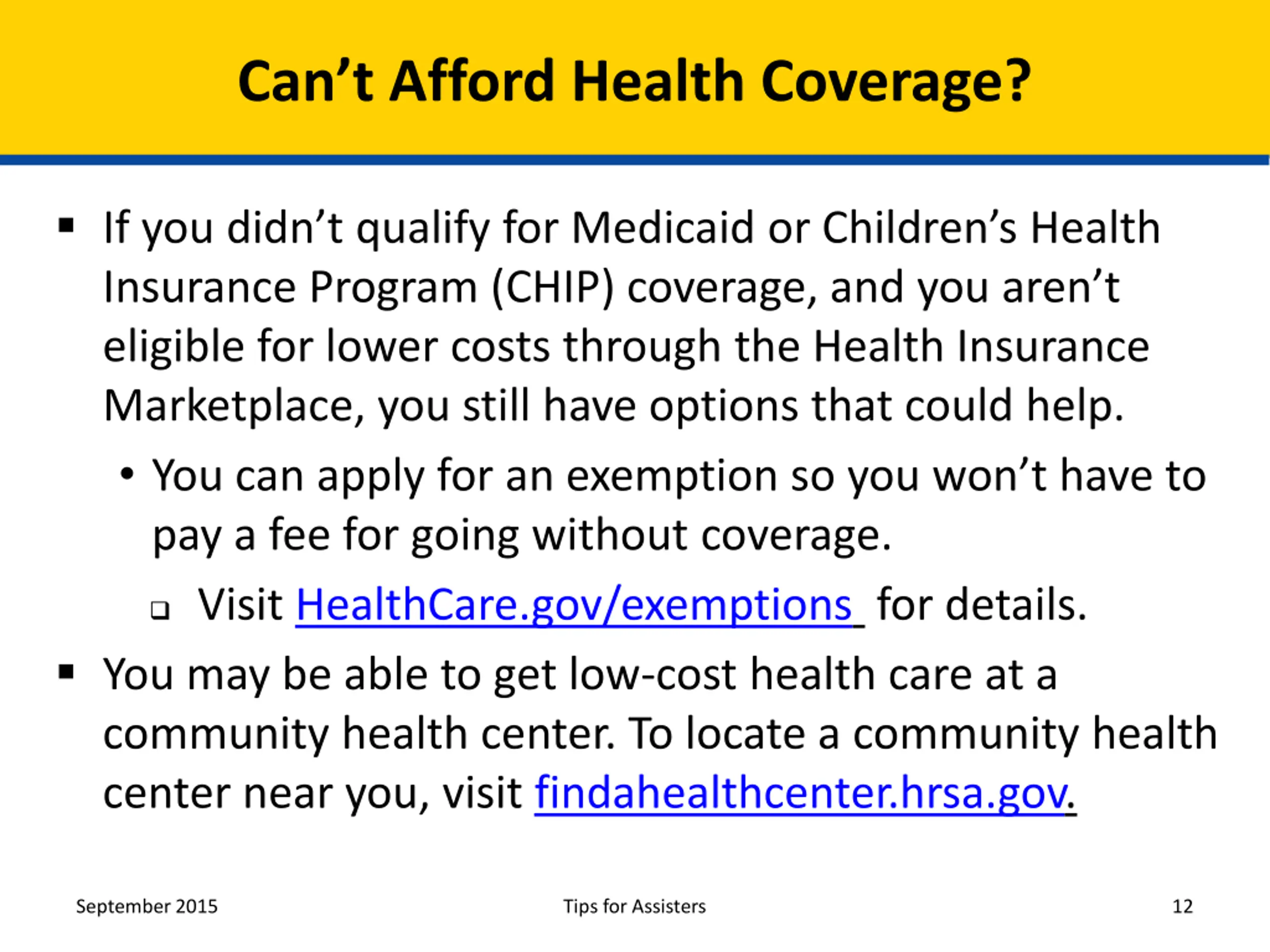 Cant Afford Health Coverage? If you didn t qualify for Medicaid or Children s Health Insurance Program (CHIP) coverage, and you aren t eligible for lower costs through the Health Insurance Marketplace, you still have options that could help. You can apply for an exemption so you won t have to pay a fee for going without coverage. Visit HealthCare.gov/exemptions for details. You may be able to get low-cost health care at a community health center. To locate a community health center near you, visit findahealthcenter.hrsa.gov. September 2015 Tips for Assisters 12