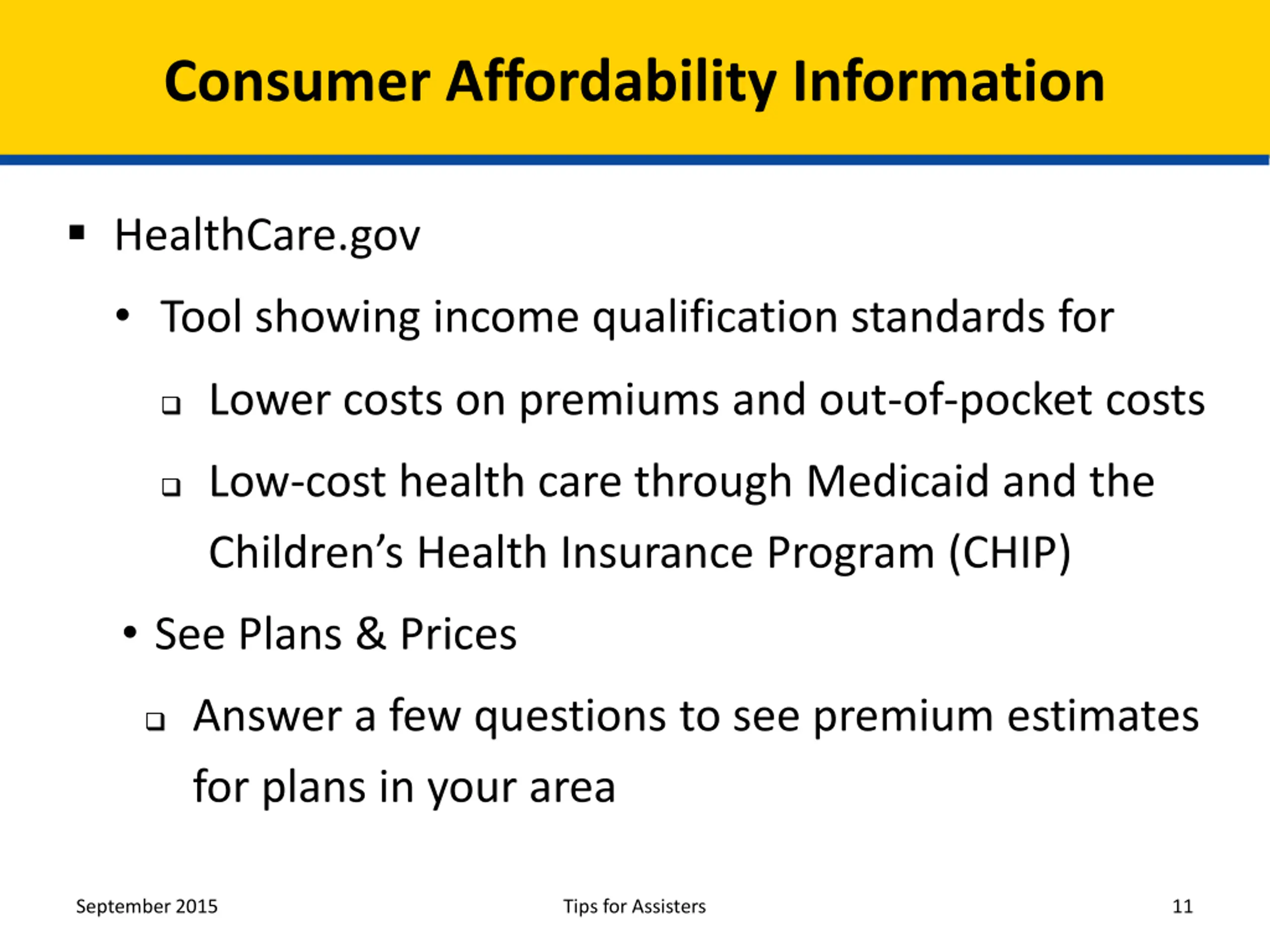 Consumer Affordability Information HealthCare.gov Tool showing income qualification standards for Lower costs on premiums and out-of-pocket costs Low-cost health care through Medicaid and the Children s Health Insurance Program (CHIP) See Plans & Prices Answer a few questions to see premium estimates for plans in your area September 2015 Tips for Assisters 11