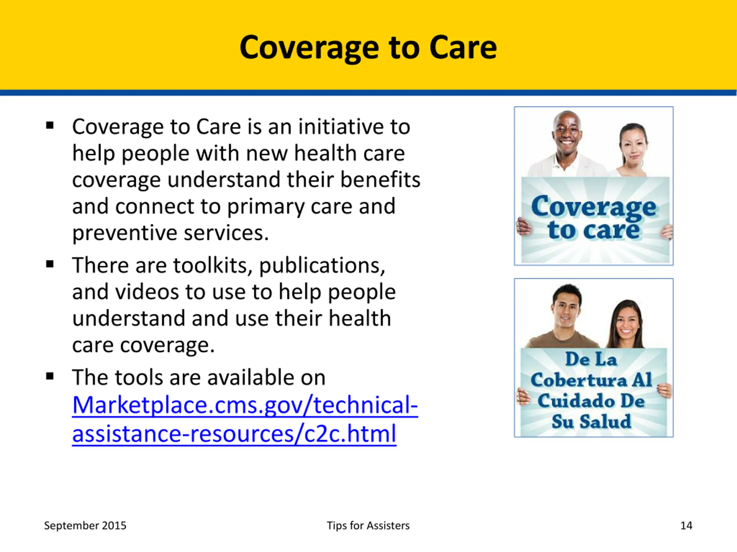 Coverage to Care Coverage to Care is an initiative to help people with new health care coverage understand their benefits and connect to primary care and preventive services. There are toolkits, publications, and videos to use to help people understand and use their health care coverage. The tools are available on Marketplace.cms.gov/technical- assistance-resources/c2c.html September 2015 Tips for Assisters 14