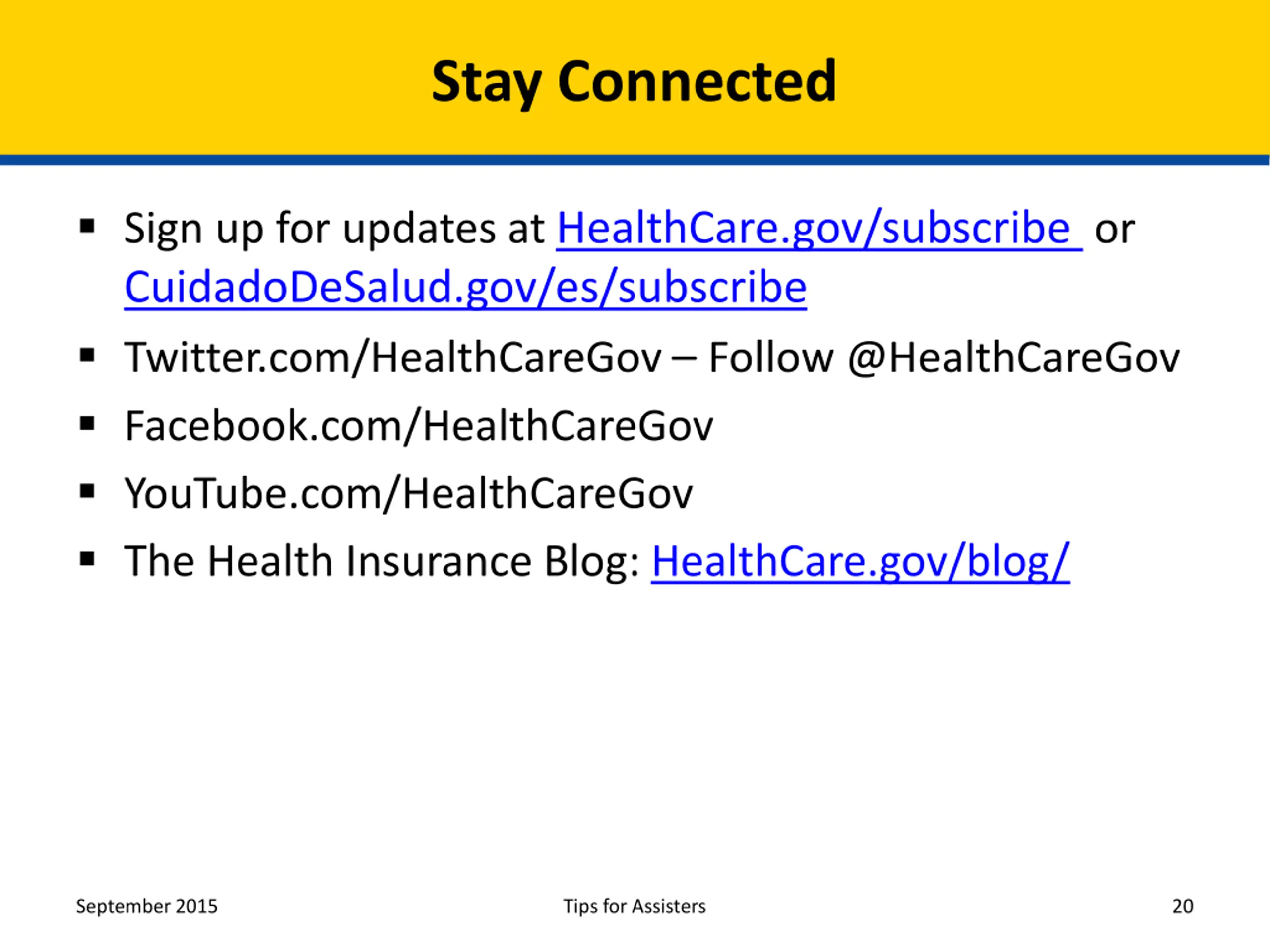 Stay Connected Sign up for updates at HealthCare.gov/subscribe or CuidadoDeSalud.gov/es/subscribe Twitter.com/HealthCareGov Follow @HealthCareGov Facebook.com/HealthCareGov YouTube.com/HealthCareGov The Health Insurance Blog: HealthCare.gov/blog/ September 2015 Tips for Assisters 20