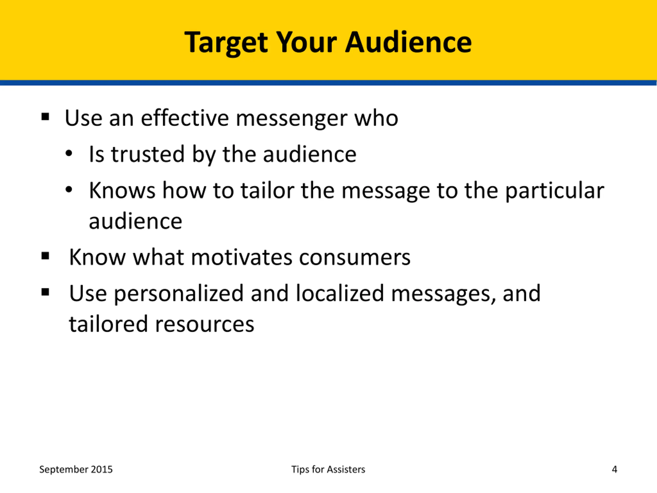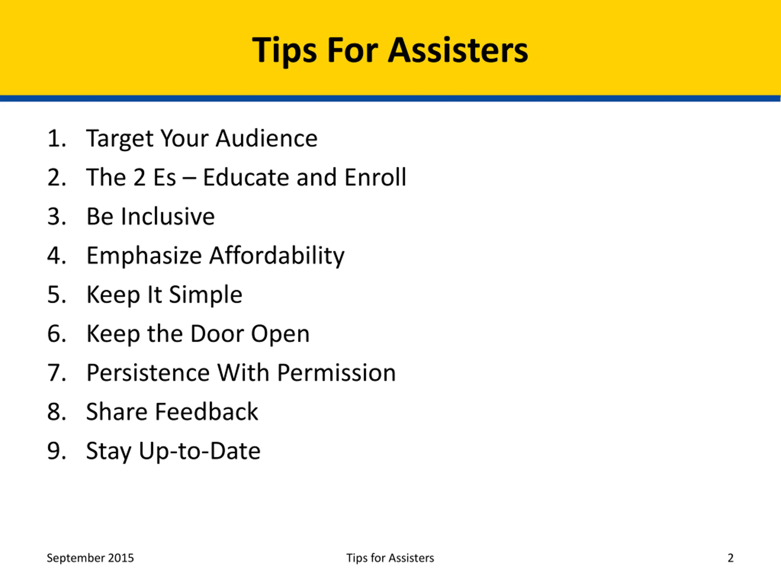 Tips For Assisters 1. Target Your Audience 2. The 2 Es Educate and Enroll 3. Be Inclusive 4. Emphasize Affordability 5. Keep It Simple 6. Keep the Door Open 7. Persistence With Permission 8. Share Feedback 9. Stay Up-to-Date September 2015 Tips for Assisters 2