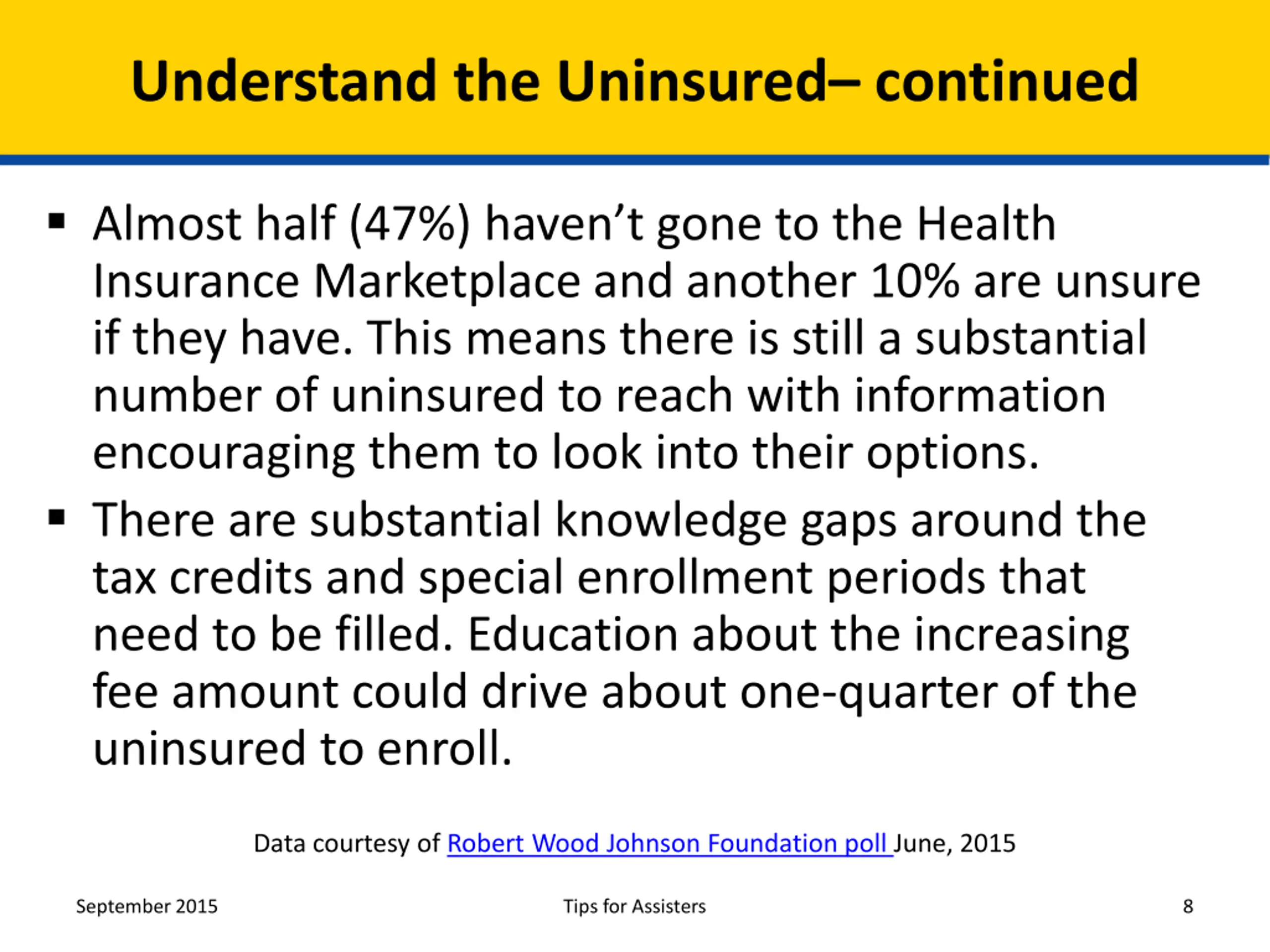 Understand the Uninsured Many are struggling financially but are optimistic about the future. They believe their finances will improve soon and that they may get insurance then. There are other reasons uninsured individuals may be putting off insurance, such as the ability to still get care and pay for it out-of-pocket even without insurance and a perception of insurance as a commitment rather than something temporary to get in between jobs. Data courtesy of Robert Wood Johnson Foundation poll June, 2015 September 2015 Tips for Assisters 7
