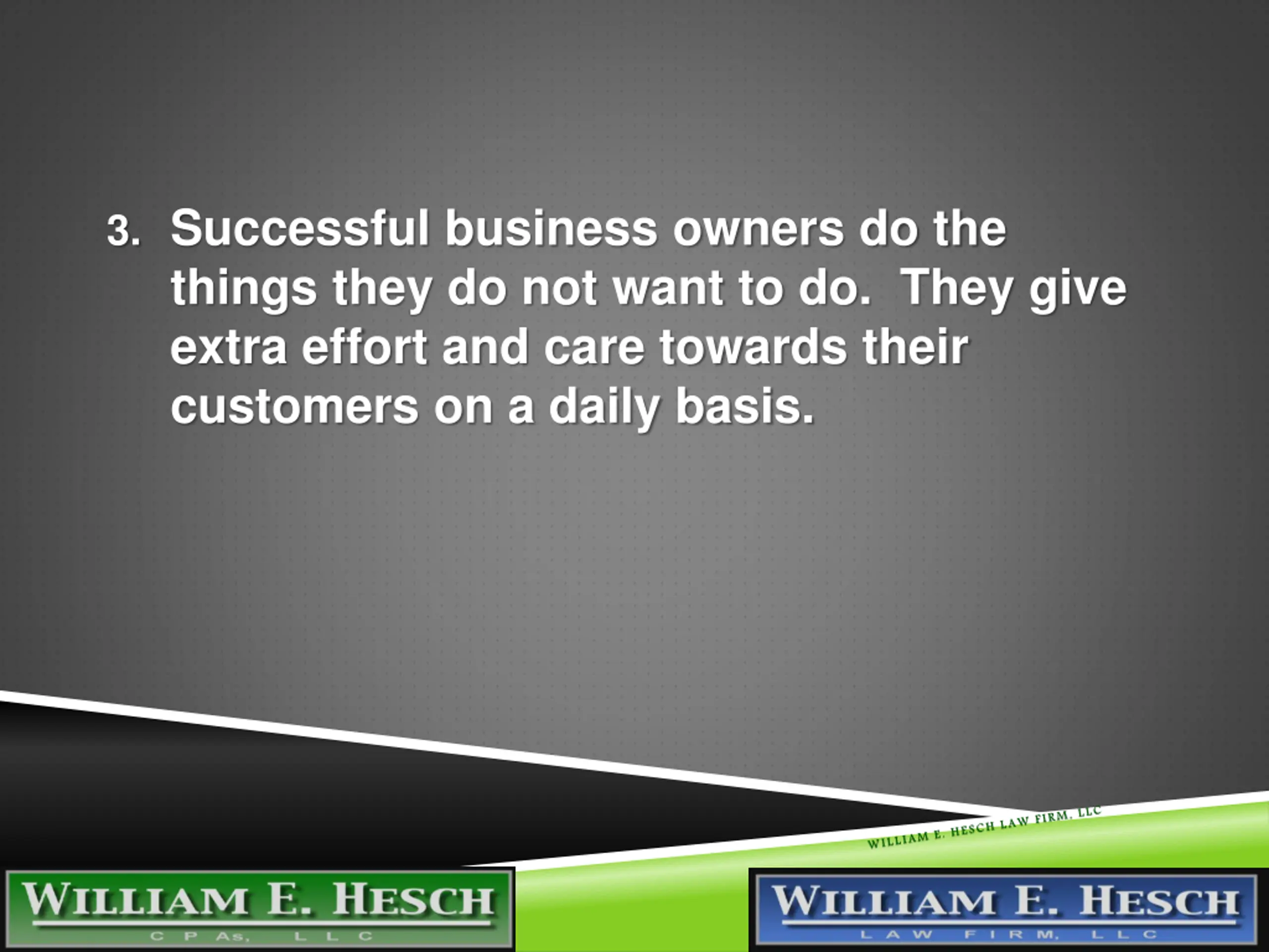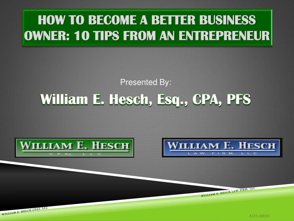 HOW TO BECOME A BETTER BUSINESS HOW TO BECOME A BETTER BUSINESS OWNER: 10 TIPS FROM AN ENTREPRENEUR OWNER: 10 TIPS FROM AN ENTREPRENEUR Presented By: William E. Hesch, Esq., CPA, PFS 3/21/2025