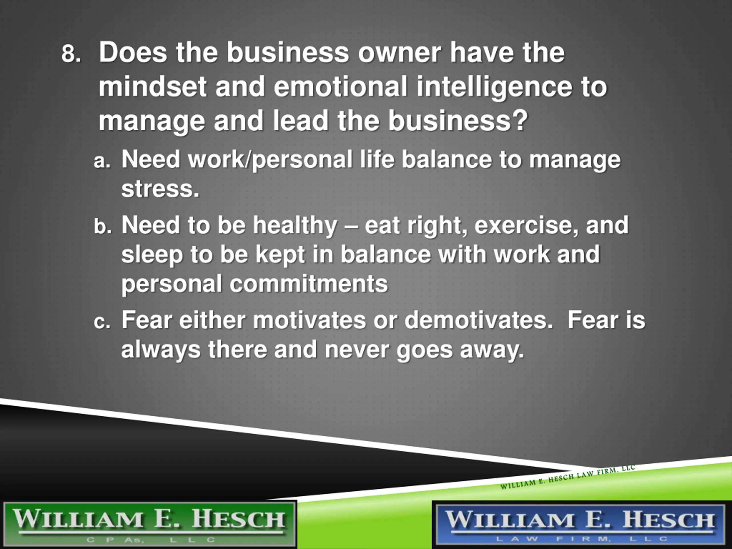 8. Does the business owner have the mindset and emotional intelligence to manage and lead the business? a. Need work/personal life balance to manage stress. b. Need to be healthy eat right, exercise, and sleep to be kept in balance with work and personal commitments c. Fear either motivates or demotivates. Fear is always there and never goes away. 3/21/2025
