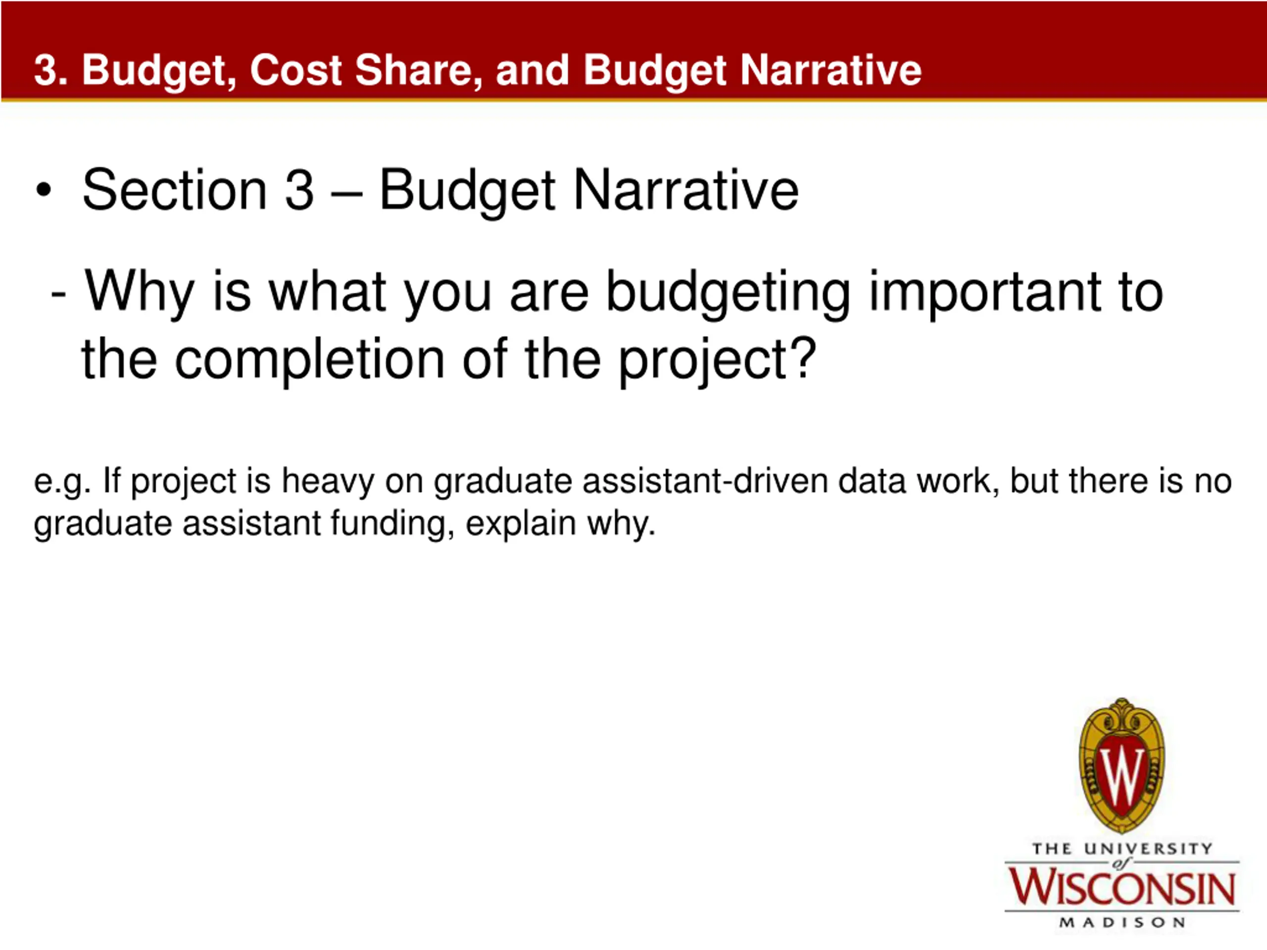 3. Budget, Cost Share, and Budget Narrative Section 3 Budget Narrative - Why is what you are budgeting important to the completion of the project? e.g. If project is heavy on graduate assistant-driven data work, but there is no graduate assistant funding, explain why.
