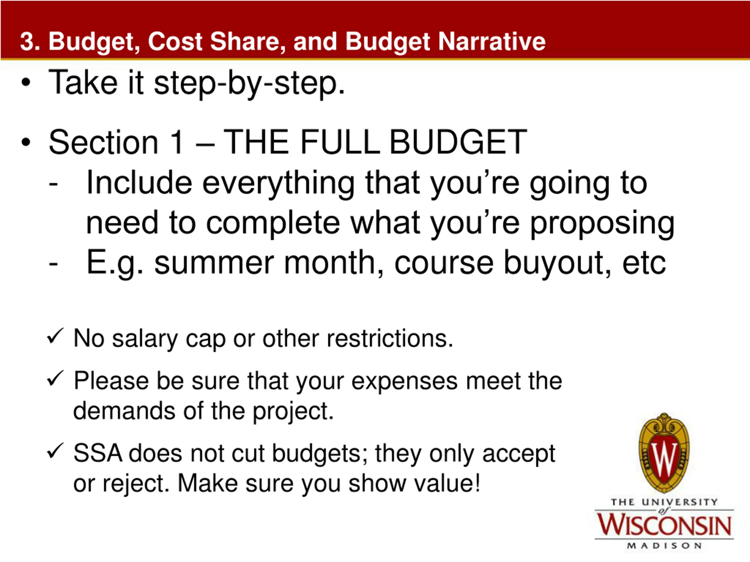 3. Budget, Cost Share, and Budget Narrative Take it step-by-step. Section 1 THE FULL BUDGET - Include everything that you re going to need to complete what you re proposing - E.g. summer month, course buyout, etc No salary cap or other restrictions. Please be sure that your expenses meet the demands of the project. SSA does not cut budgets; they only accept or reject. Make sure you show value!