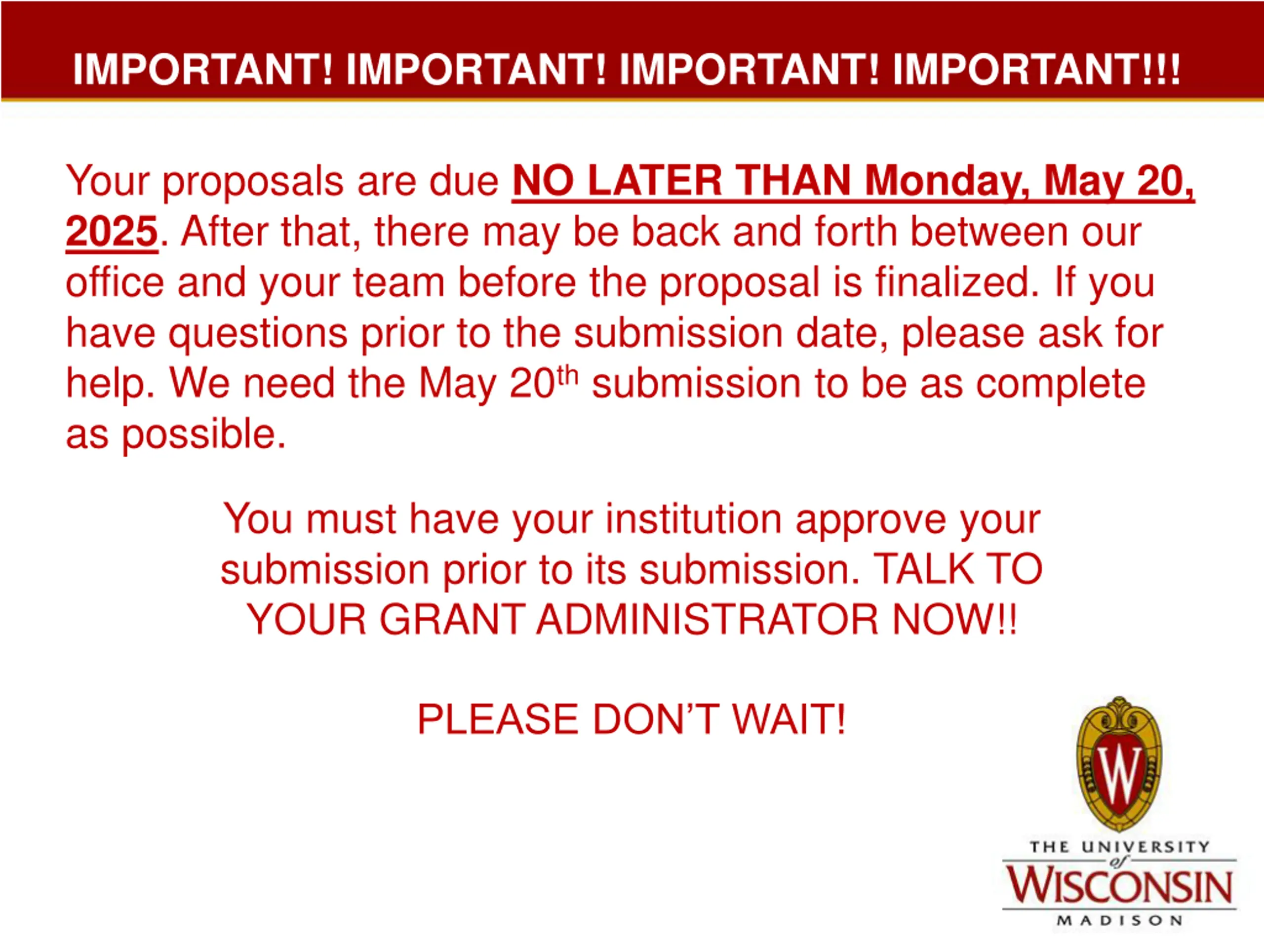 IMPORTANT! IMPORTANT! IMPORTANT! IMPORTANT!!! Your proposals are due NO LATER THAN Monday, May 20, 2025. After that, there may be back and forth between our office and your team before the proposal is finalized. If you have questions prior to the submission date, please ask for help. We need the May 20th submission to be as complete as possible. You must have your institution approve your submission prior to its submission. TALK TO YOUR GRANT ADMINISTRATOR NOW!! PLEASE DON T WAIT!