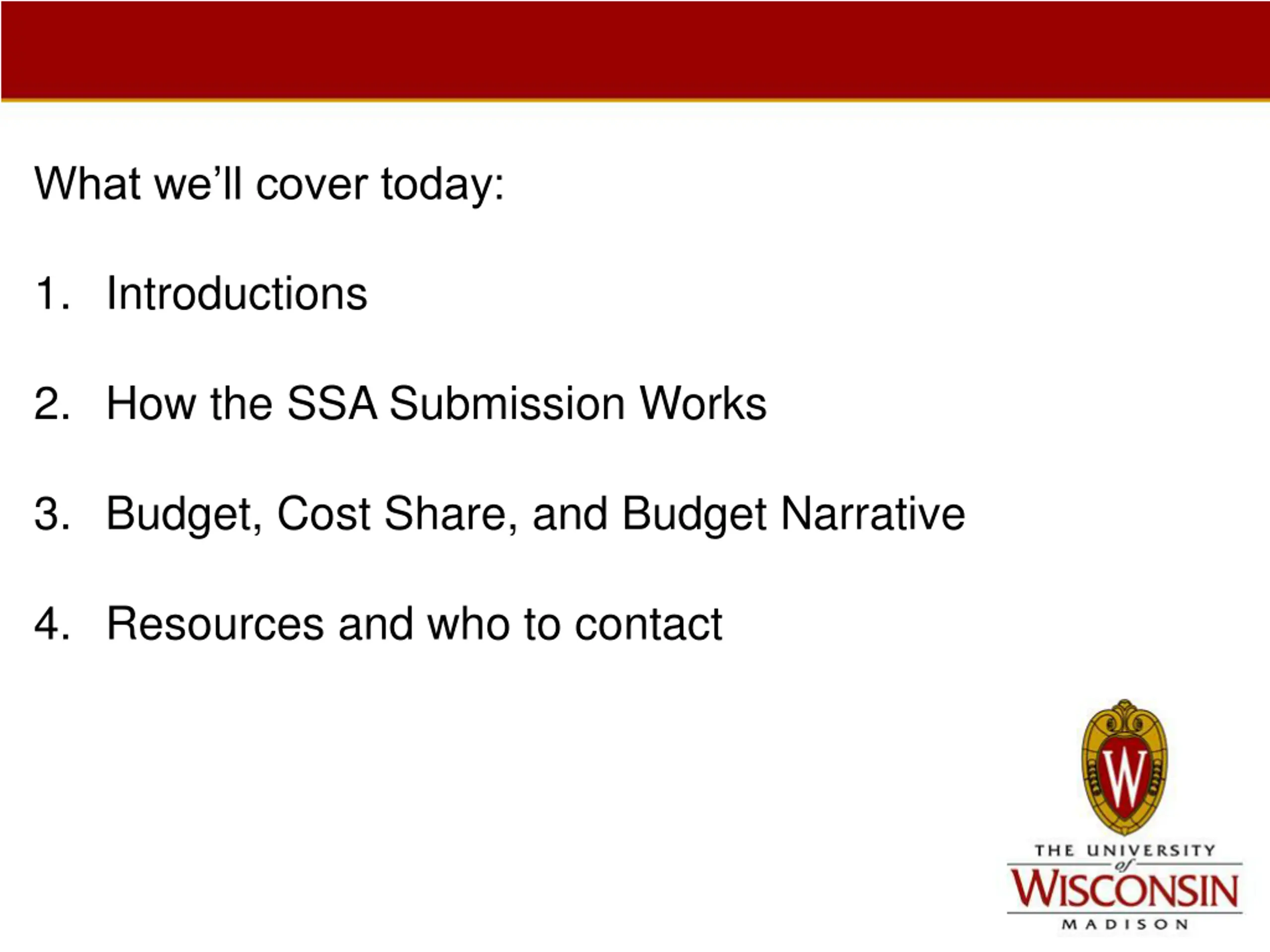 What well cover today: 1. Introductions 2. How the SSA Submission Works 3. Budget, Cost Share, and Budget Narrative 4. Resources and who to contact