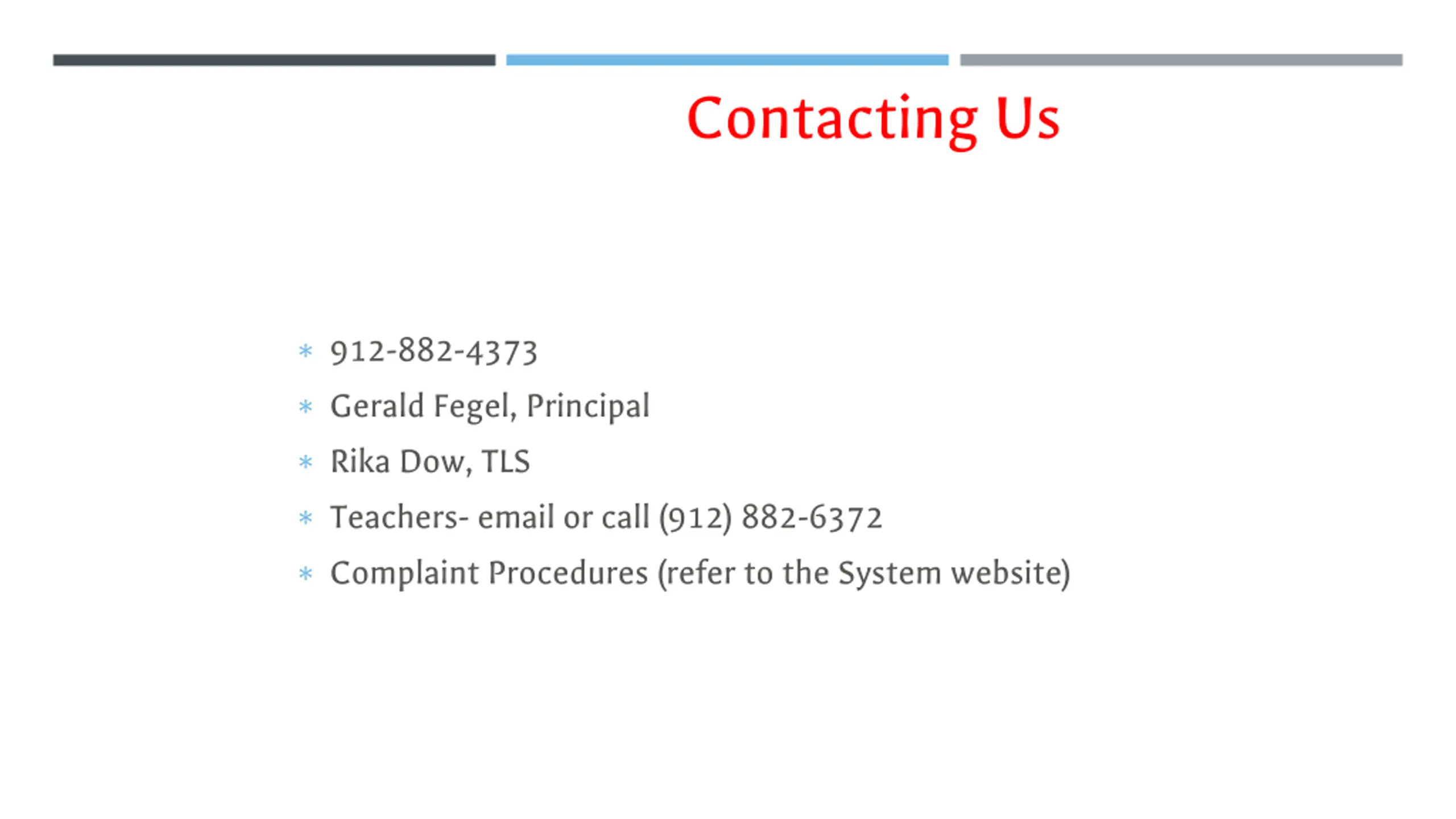 Contacting Us 912-882-4373 Gerald Fegel, Principal Rika Dow, TLS Teachers- email or call (912) 882-6372 Complaint Procedures (refer to the System website)