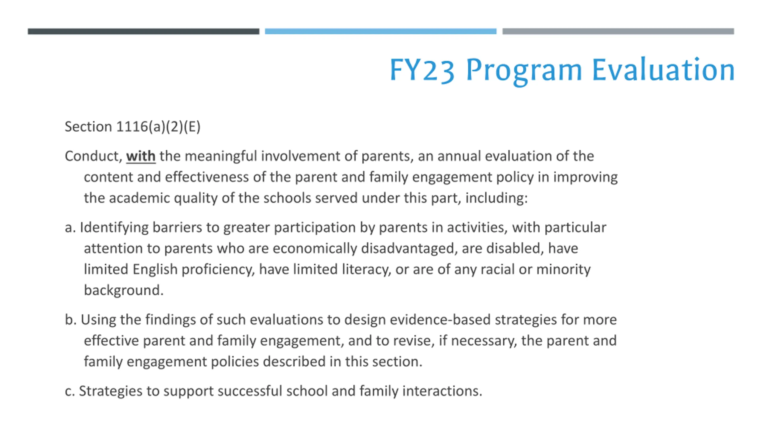 FY23 Program Evaluation Section 1116(a)(2)(E) Conduct, with the meaningful involvement of parents, an annual evaluation of the content and effectiveness of the parent and family engagement policy in improving the academic quality of the schools served under this part, including: a. Identifying barriers to greater participation by parents in activities, with particular attention to parents who are economically disadvantaged, are disabled, have limited English proficiency, have limited literacy, or are of any racial or minority background. b. Using the findings of such evaluations to design evidence-based strategies for more effective parent and family engagement, and to revise, if necessary, the parent and family engagement policies described in this section. c. Strategies to support successful school and family interactions.