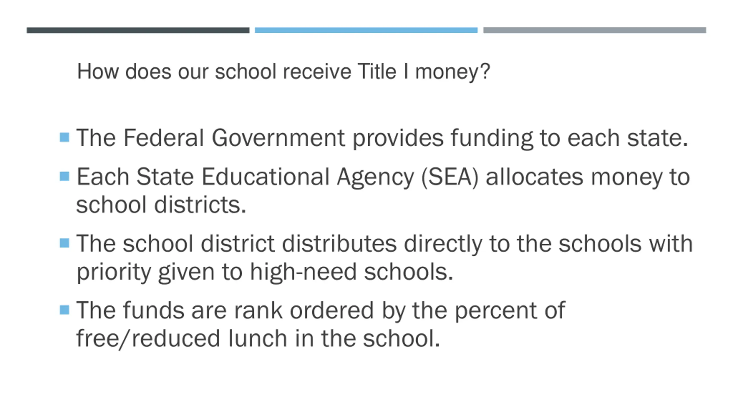 How does our school receive Title I money? The Federal Government provides funding to each state. Each State Educational Agency (SEA) allocates money to school districts. The school district distributes directly to the schools with priority given to high-need schools. The funds are rank ordered by the percent of free/reduced lunch in the school.