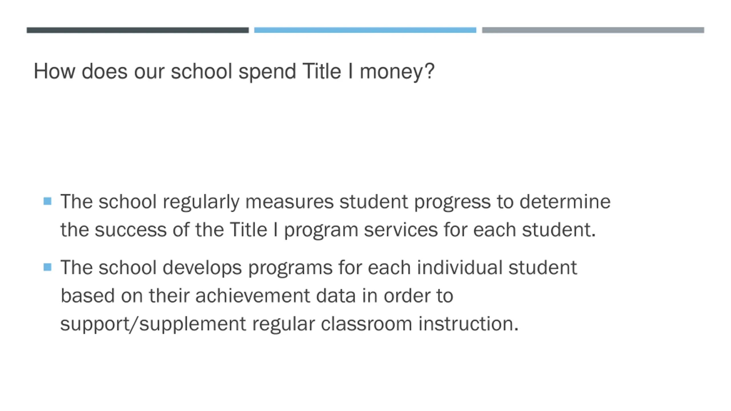How does our school spend Title I money? The school regularly measures student progress to determine the success of the Title I program services for each student. The school develops programs for each individual student based on their achievement data in order to support/supplement regular classroom instruction.
