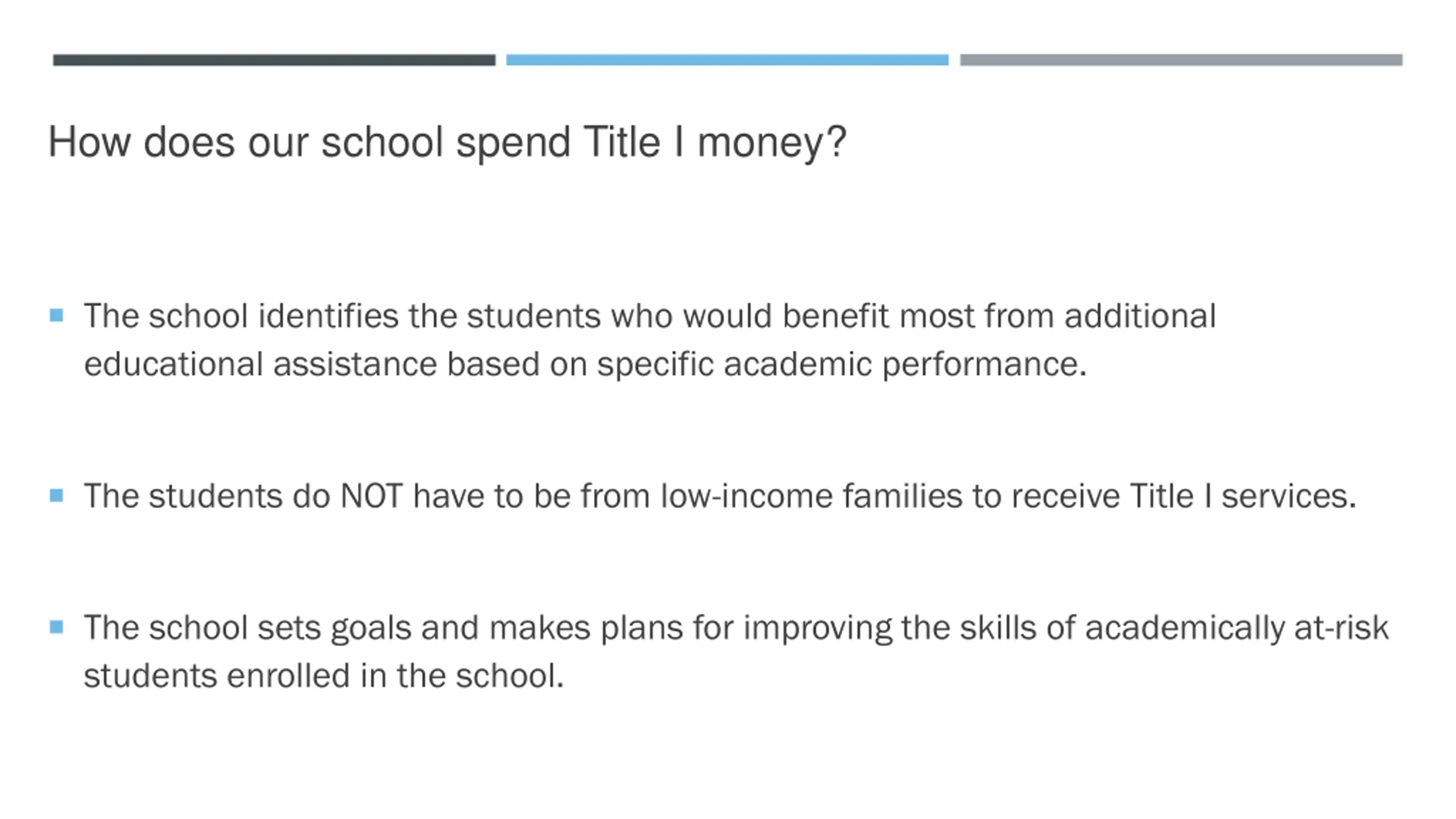 How does our school spend Title I money? The school identifies the students who would benefit most from additional educational assistance based on specific academic performance. The students do NOT have to be from low-income families to receive Title I services. The school sets goals and makes plans for improving the skills of academically at-risk students enrolled in the school.