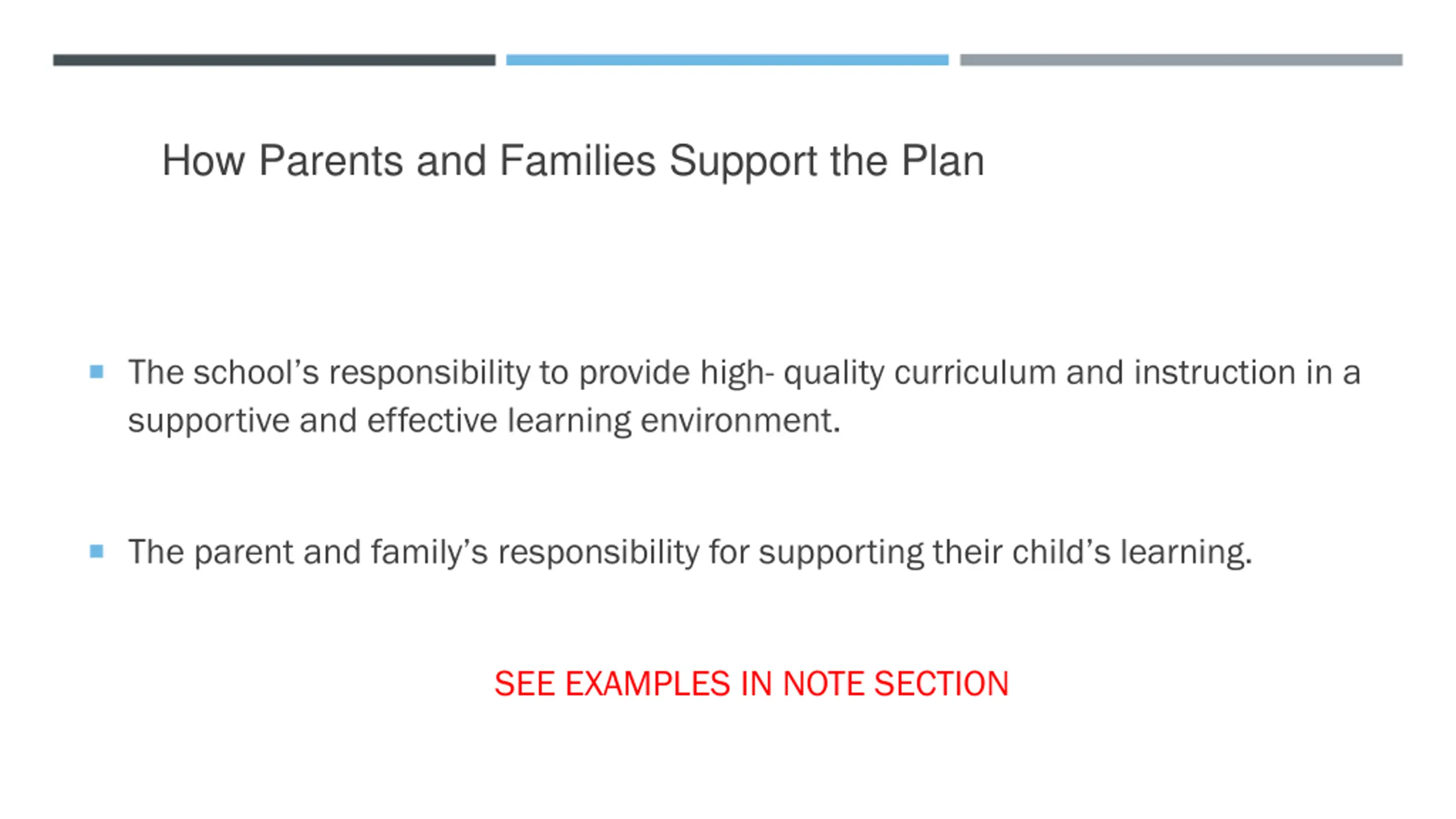 How Parents and Families Support the Plan The school s responsibility to provide high- quality curriculum and instruction in a supportive and effective learning environment. The parent and family s responsibility for supporting their child s learning. SEE EXAMPLES IN NOTE SECTION
