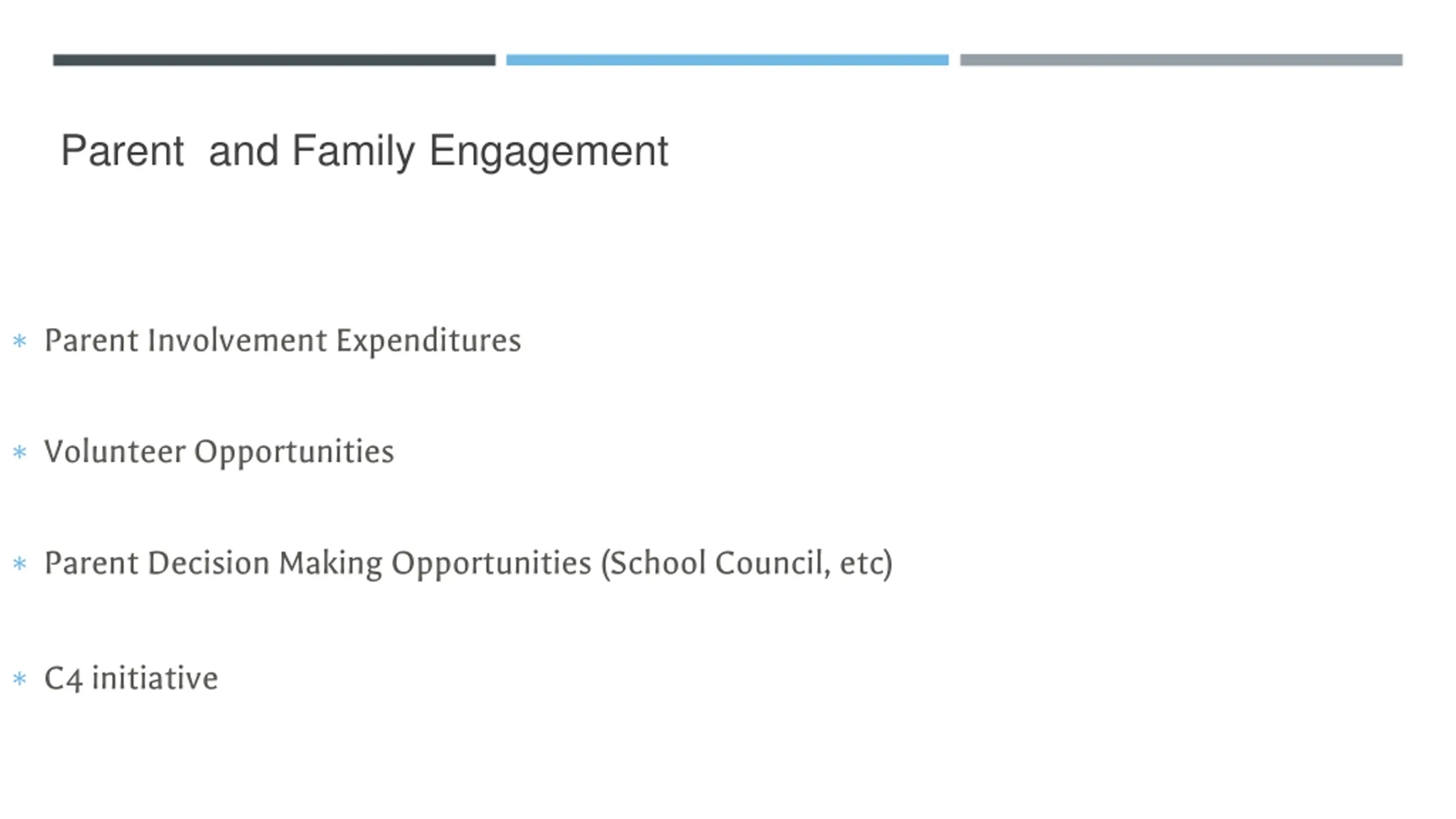 Parent and Family Engagement Parent Involvement Expenditures Volunteer Opportunities Parent Decision Making Opportunities (School Council, etc) C4 initiative