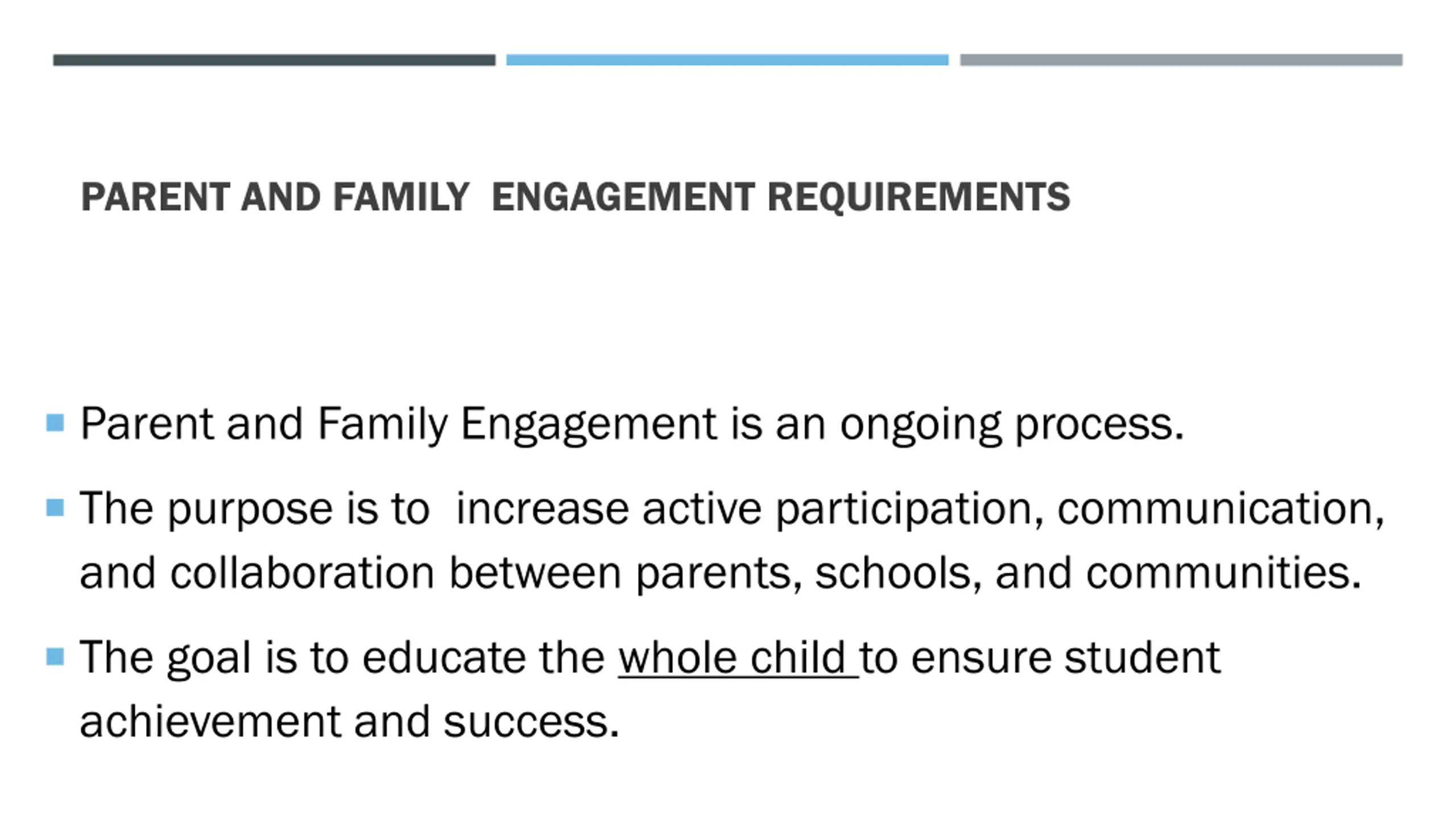 PARENT AND FAMILY ENGAGEMENT REQUIREMENTS Parent and Family Engagement is an ongoing process. The purpose is to increase active participation, communication, and collaboration between parents, schools, and communities. The goal is to educate the whole child to ensure student achievement and success.