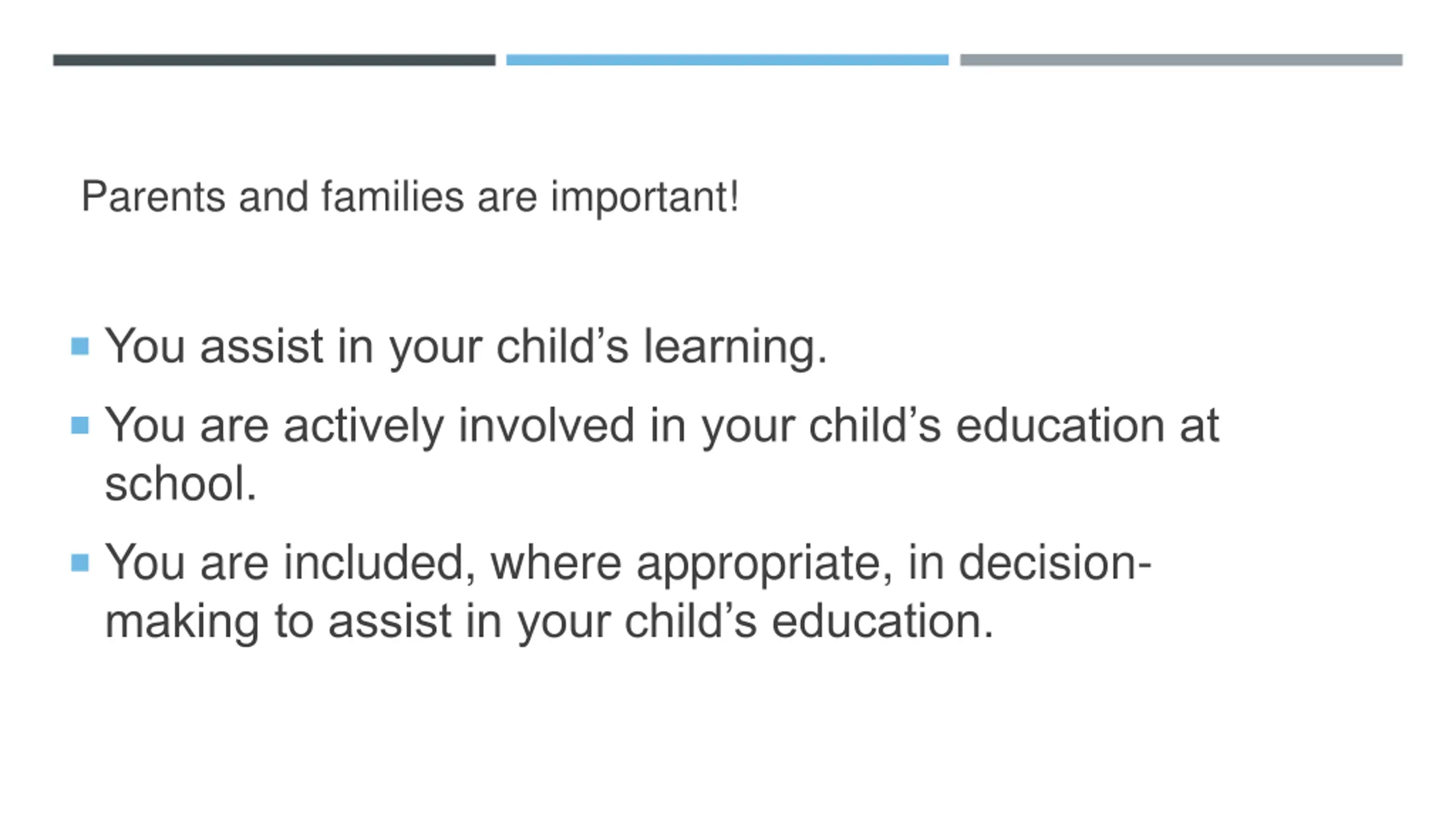 Parents and families are important! You assist in your child s learning. You are actively involved in your child s education at school. You are included, where appropriate, in decision- making to assist in your child s education.