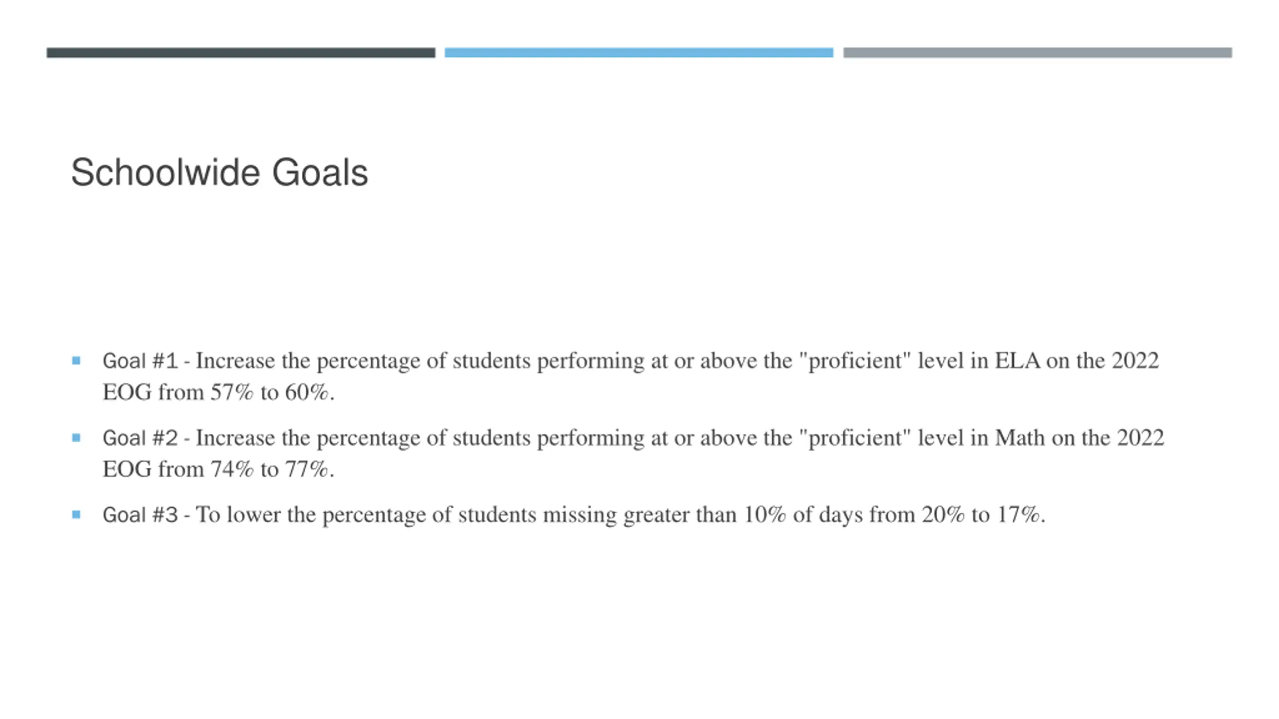 Schoolwide Goals Goal #1 - Increase the percentage of students performing at or above the "proficient" level in ELA on the 2022 EOG from 57% to 60%. Goal #2 - Increase the percentage of students performing at or above the "proficient" level in Math on the 2022 EOG from 74% to 77%. Goal #3 - To lower the percentage of students missing greater than 10% of days from 20% to 17%.
