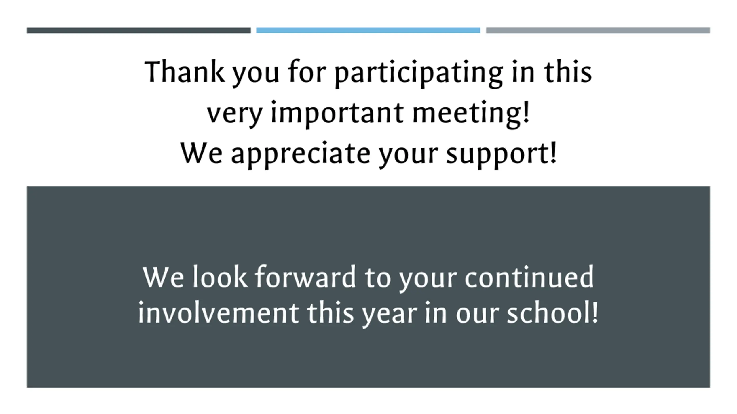 Thank you for participating in this very important meeting! We appreciate your support! We look forward to your continued involvement this year in our school!