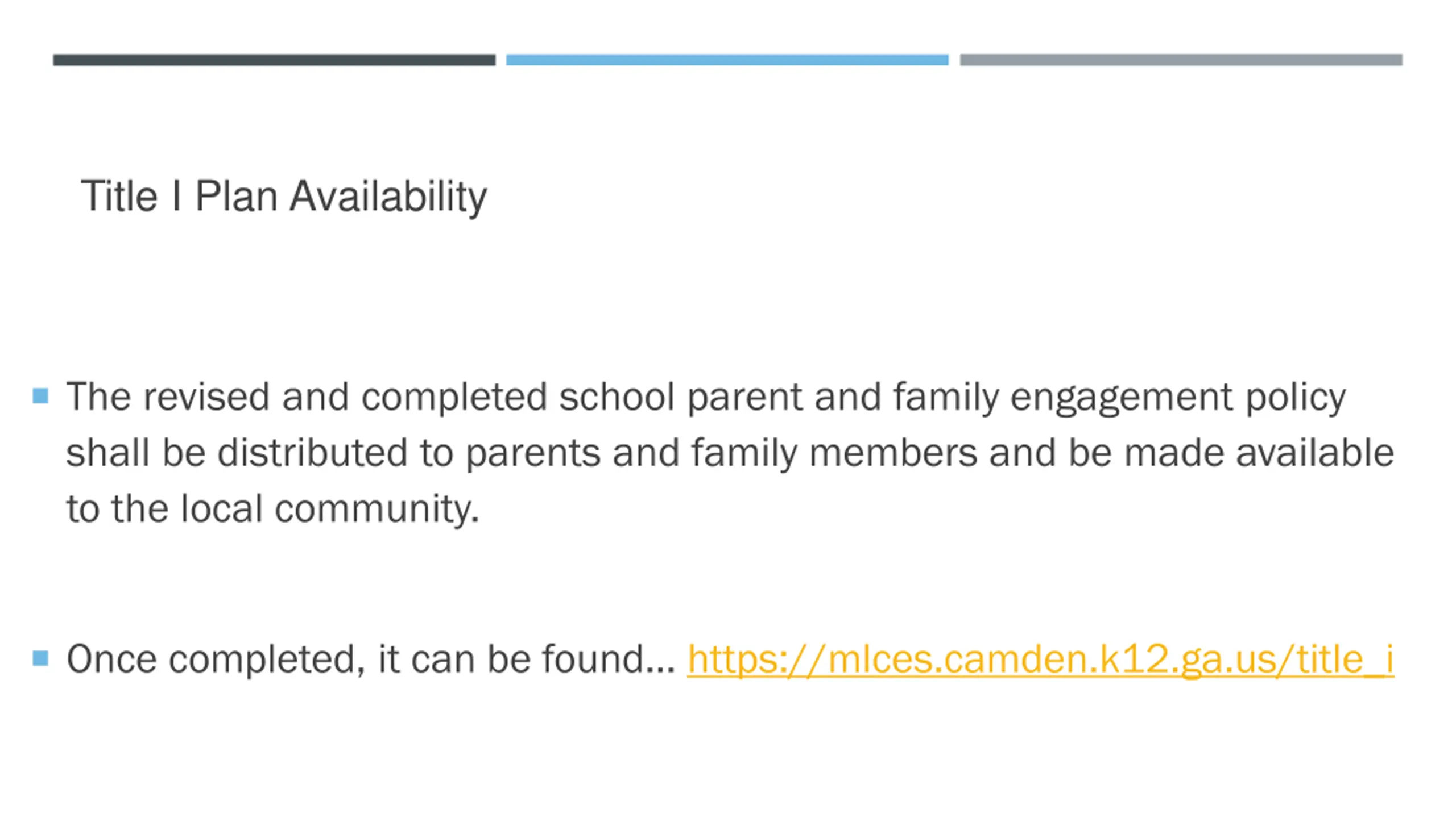 Title I Plan Availability The revised and completed school parent and family engagement policy shall be distributed to parents and family members and be made available to the local community. Once completed, it can be found https://mlces.camden.k12.ga.us/title_i