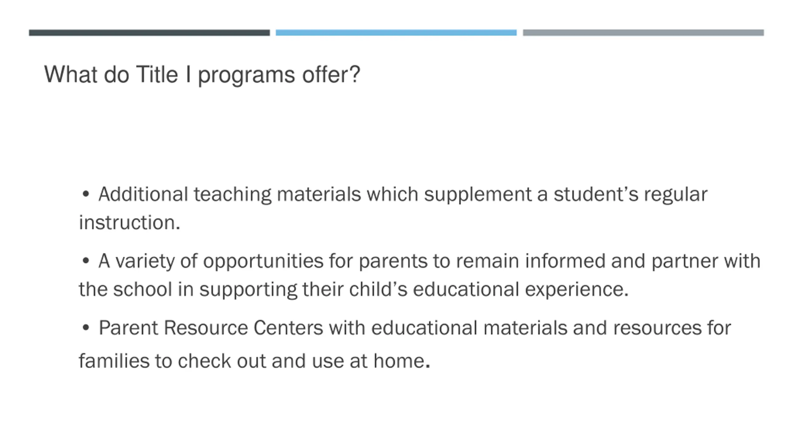 What do Title I programs offer? Additional teaching materials which supplement a student s regular instruction. A variety of opportunities for parents to remain informed and partner with the school in supporting their child s educational experience. Parent Resource Centers with educational materials and resources for families to check out and use at home.