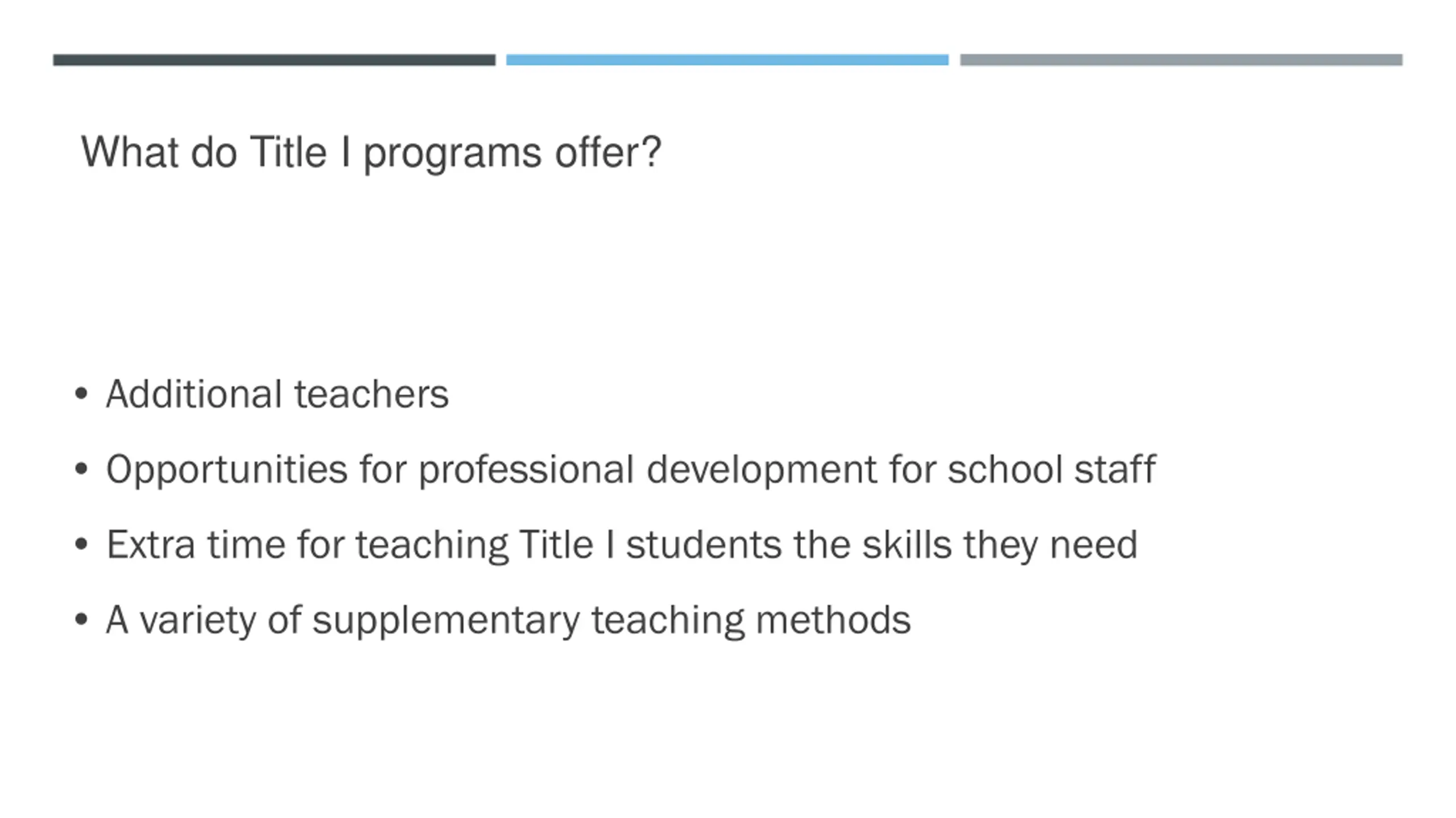 What do Title I programs offer? Additional teachers Opportunities for professional development for school staff Extra time for teaching Title I students the skills they need A variety of supplementary teaching methods