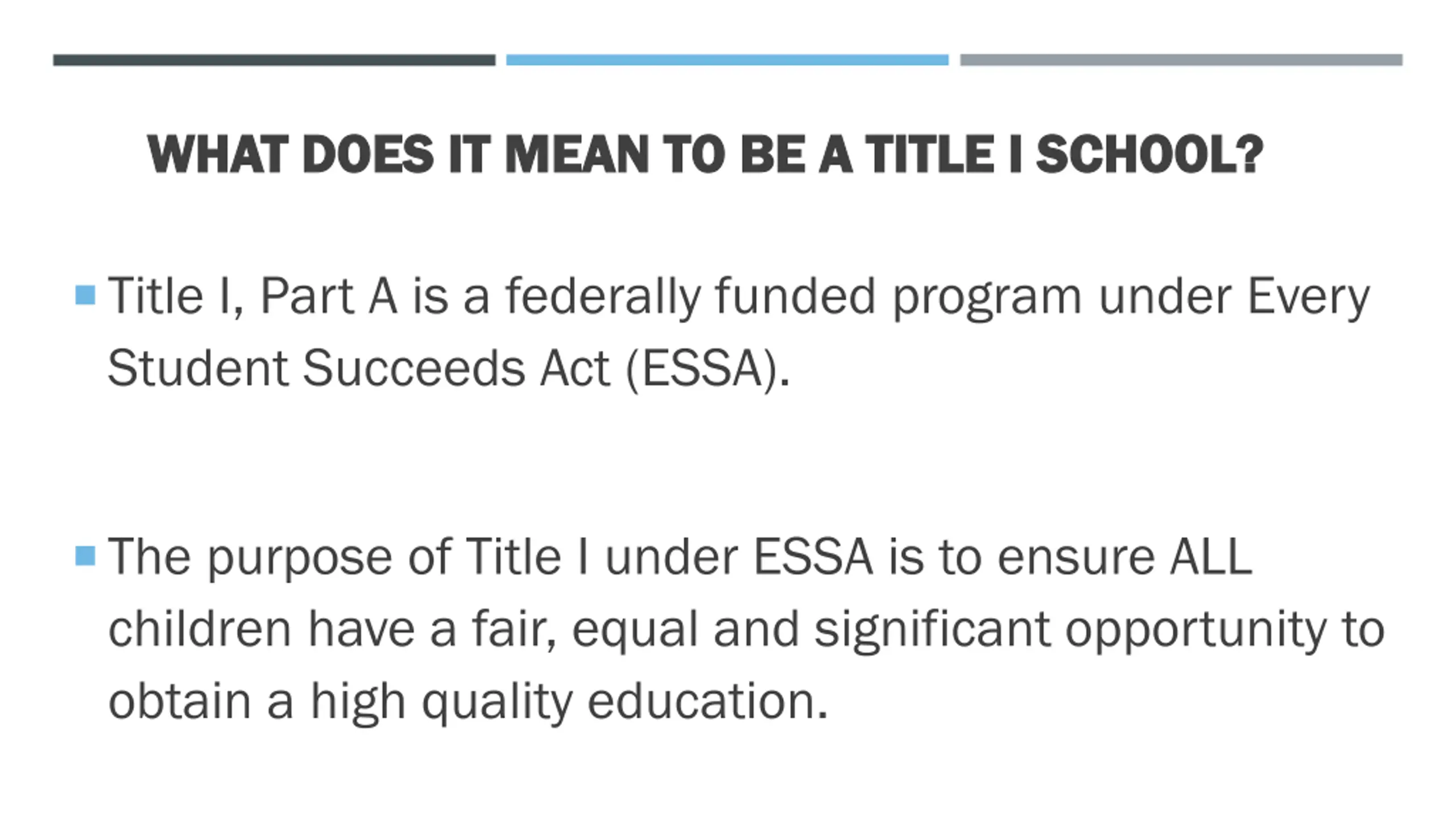 WHAT DOES IT MEAN TO BE A TITLE I SCHOOL? WHAT DOES IT MEAN TO BE A TITLE I SCHOOL? Title I, Part A is a federally funded program under Every Student Succeeds Act (ESSA). The purpose of Title I under ESSA is to ensure ALL children have a fair, equal and significant opportunity to obtain a high quality education.