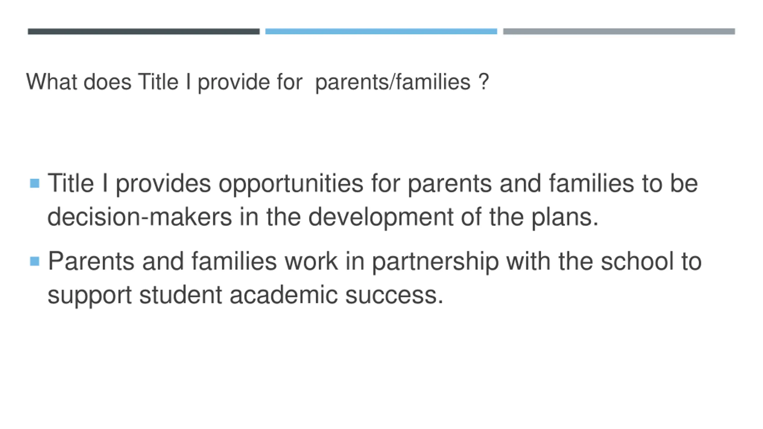 What does Title I provide for parents/families ? Title I provides opportunities for parents and families to be decision-makers in the development of the plans. Parents and families work in partnership with the school to support student academic success.