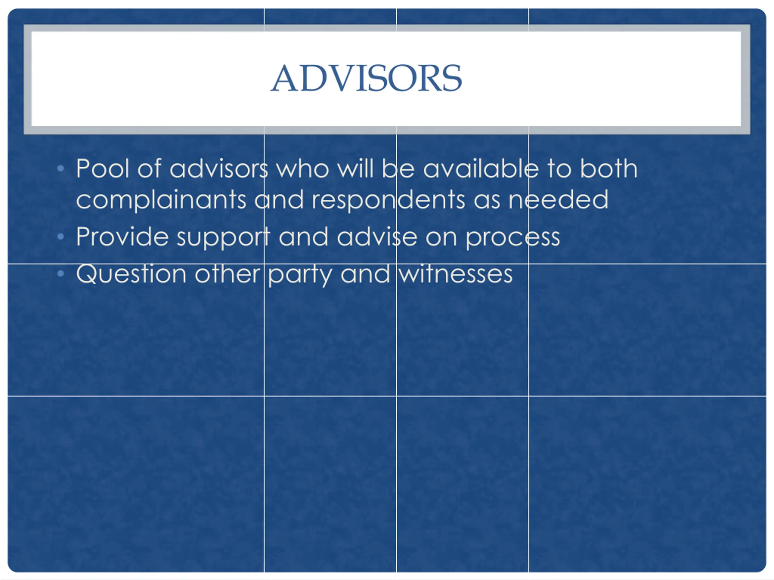 ADVISORS Pool of advisors who will be available to both complainants and respondents as needed Provide support and advise on process Question other party and witnesses