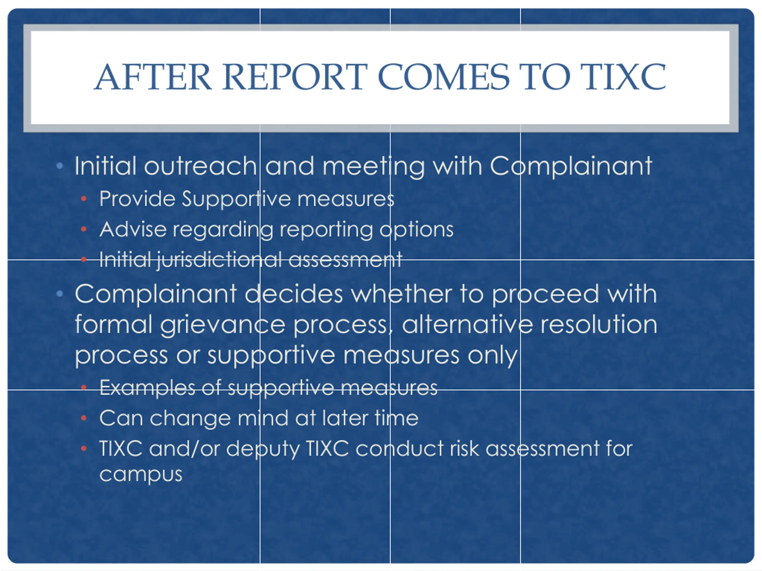 AFTER REPORT COMES TO TIXC Initial outreach and meeting with Complainant Provide Supportive measures Advise regarding reporting options Initial jurisdictional assessment Complainant decides whether to proceed with formal grievance process, alternative resolution process or supportive measures only Examples of supportive measures Can change mind at later time TIXC and/or deputy TIXC conduct risk assessment for campus