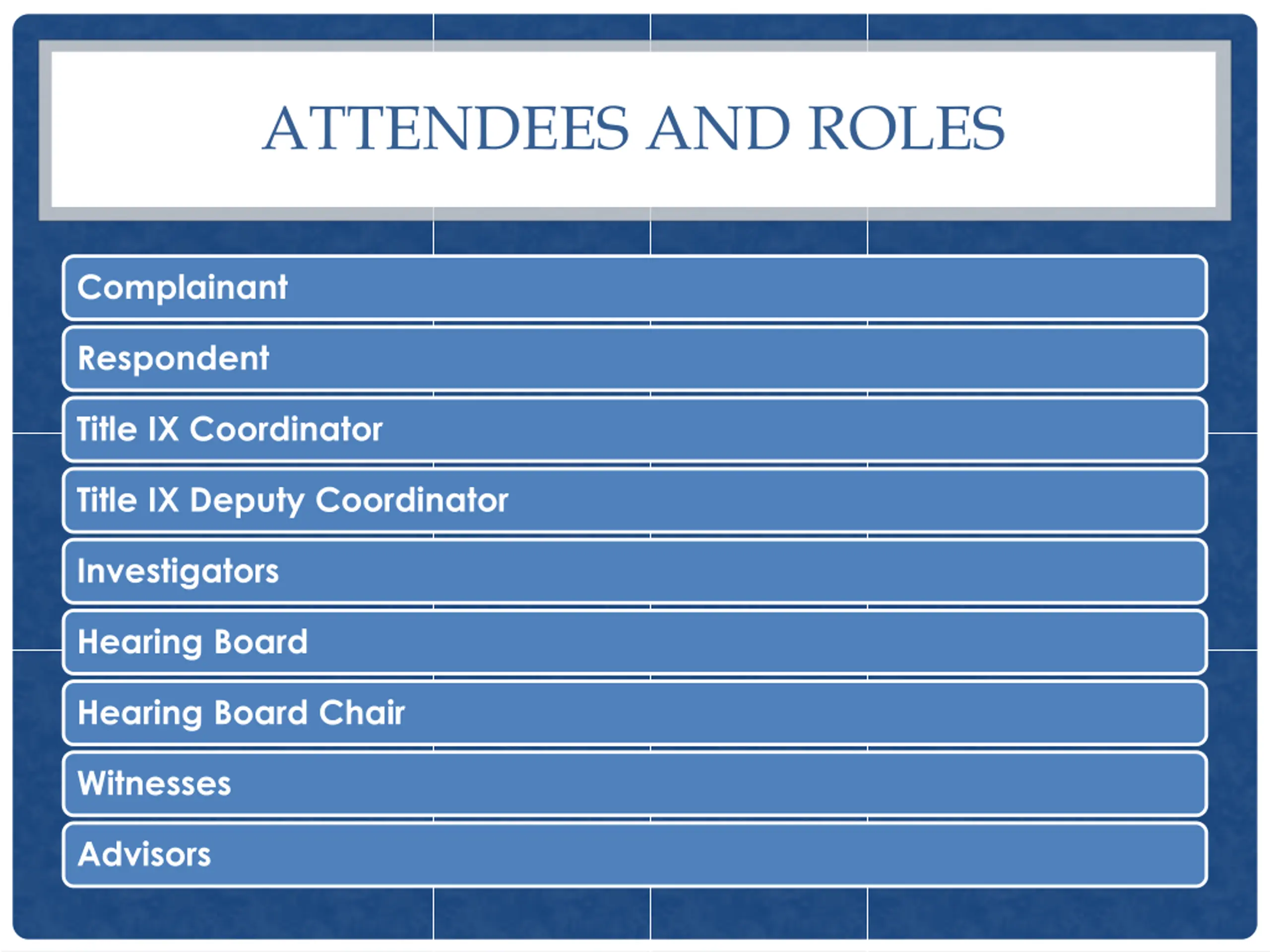 ATTENDEES AND ROLES Complainant Respondent Title IX Coordinator Title IX Deputy Coordinator Investigators Hearing Board Hearing Board Chair Witnesses Advisors