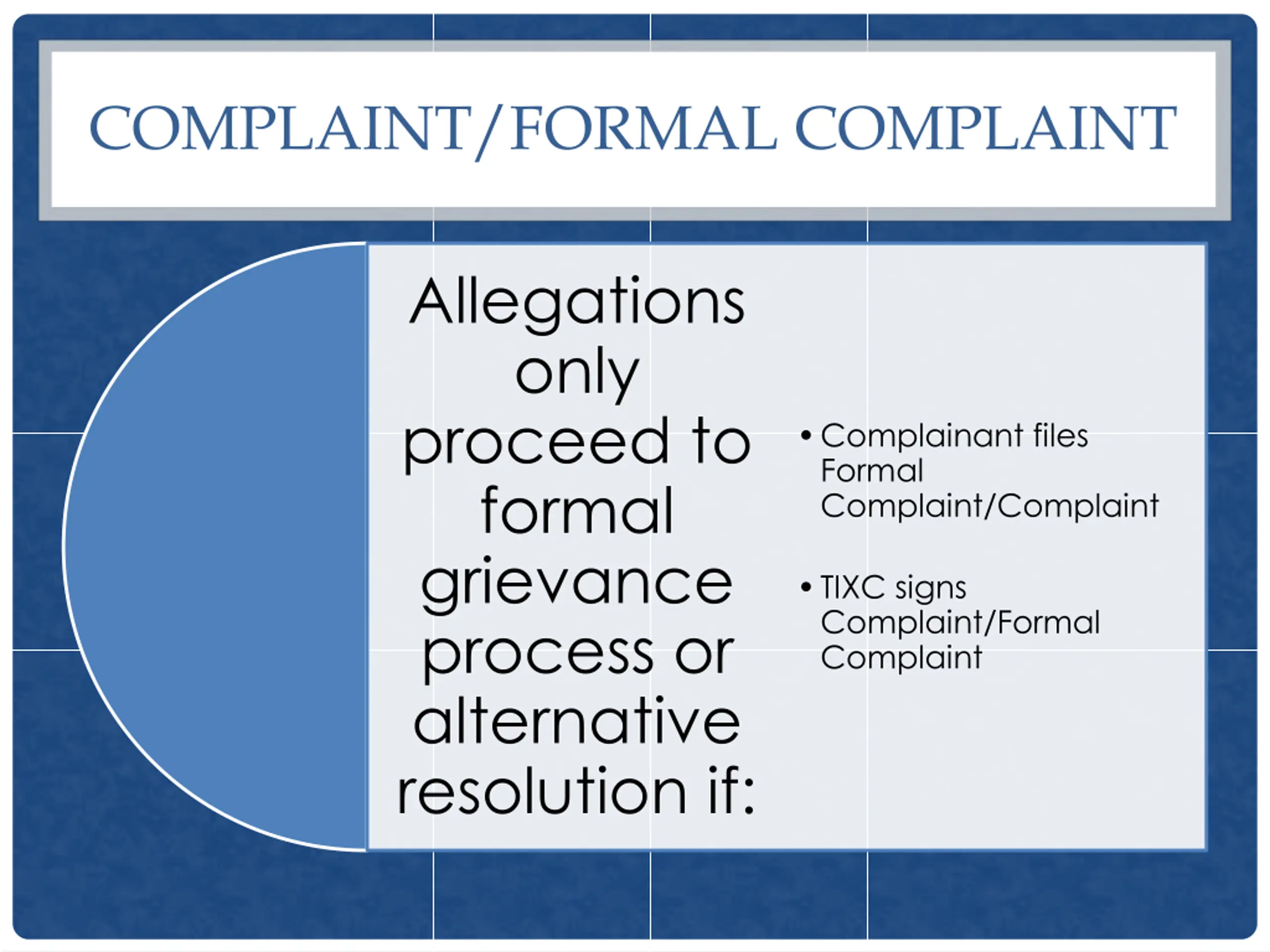 COMPLAINT/FORMAL COMPLAINT Allegations only proceed to formal grievance process or alternative resolution if: Complainant files Formal Complaint/Complaint TIXC signs Complaint/Formal Complaint