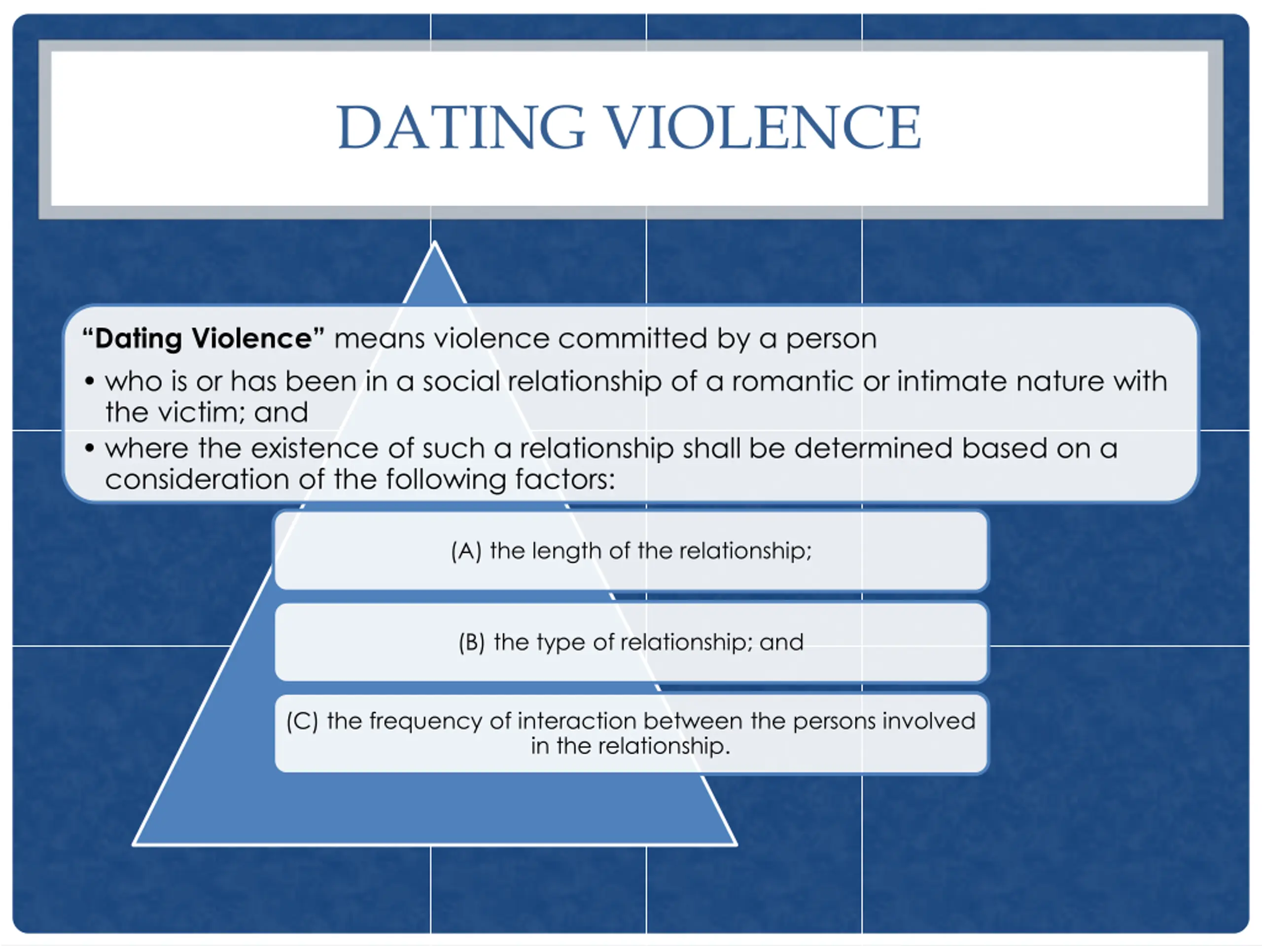 DATING VIOLENCE Dating Violence means violence committed by a person who is or has been in a social relationship of a romantic or intimate nature with the victim; and where the existence of such a relationship shall be determined based on a consideration of the following factors: (A) the length of the relationship; (B) the type of relationship; and (C) the frequency of interaction between the persons involved in the relationship.