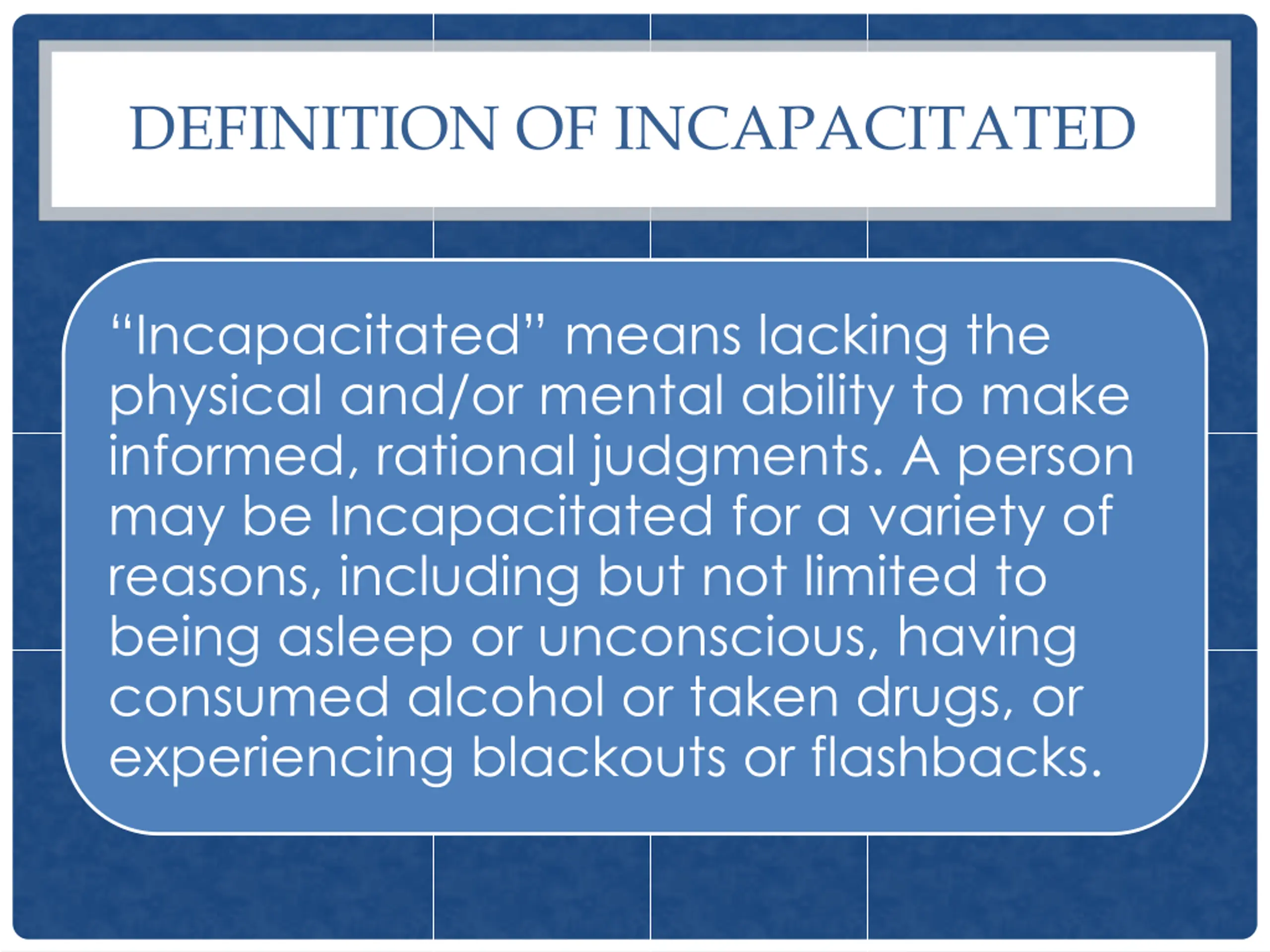 DEFINITION OF INCAPACITATED Incapacitated means lacking the physical and/or mental ability to make informed, rational judgments. A person may be Incapacitated for a variety of reasons, including but not limited to being asleep or unconscious, having consumed alcohol or taken drugs, or experiencing blackouts or flashbacks.