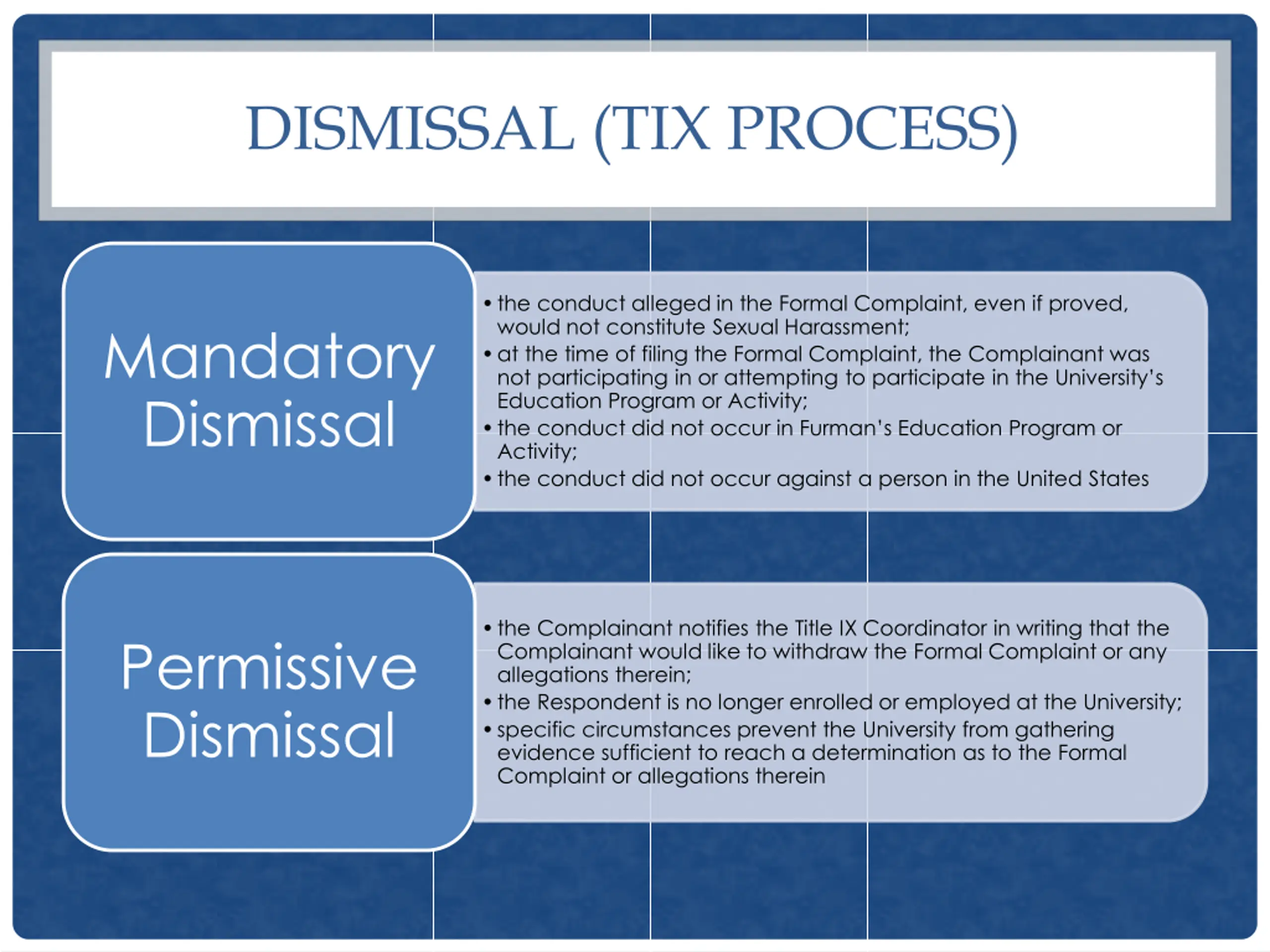 DISMISSAL (TIX PROCESS) the conduct alleged in the Formal Complaint, even if proved, would not constitute Sexual Harassment; at the time of filing the Formal Complaint, the Complainant was not participating in or attempting to participate in the University s Education Program or Activity; the conduct did not occur in Furman s Education Program or Activity; the conduct did not occur against a person in the United States Mandatory Dismissal the Complainant notifies the Title IX Coordinator in writing that the Complainant would like to withdraw the Formal Complaint or any allegations therein; the Respondent is no longer enrolled or employed at the University; specific circumstances prevent the University from gathering evidence sufficient to reach a determination as to the Formal Complaint or allegations therein Permissive Dismissal