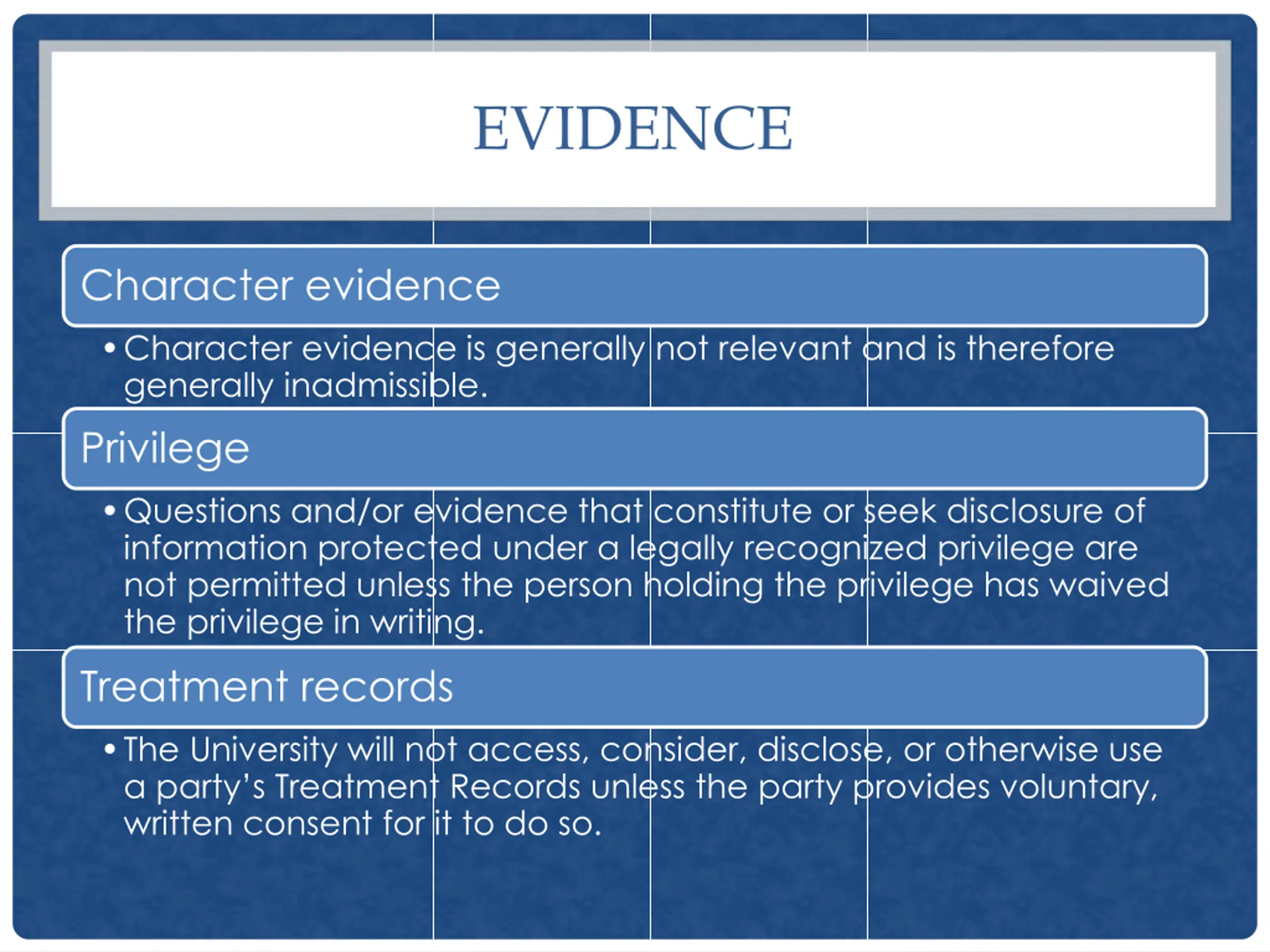 EVIDENCE Character evidence Character evidence is generally not relevant and is therefore generally inadmissible. Privilege Questions and/or evidence that constitute or seek disclosure of information protected under a legally recognized privilege are not permitted unless the person holding the privilege has waived the privilege in writing. Treatment records The University will not access, consider, disclose, or otherwise use a party s Treatment Records unless the party provides voluntary, written consent for it to do so.