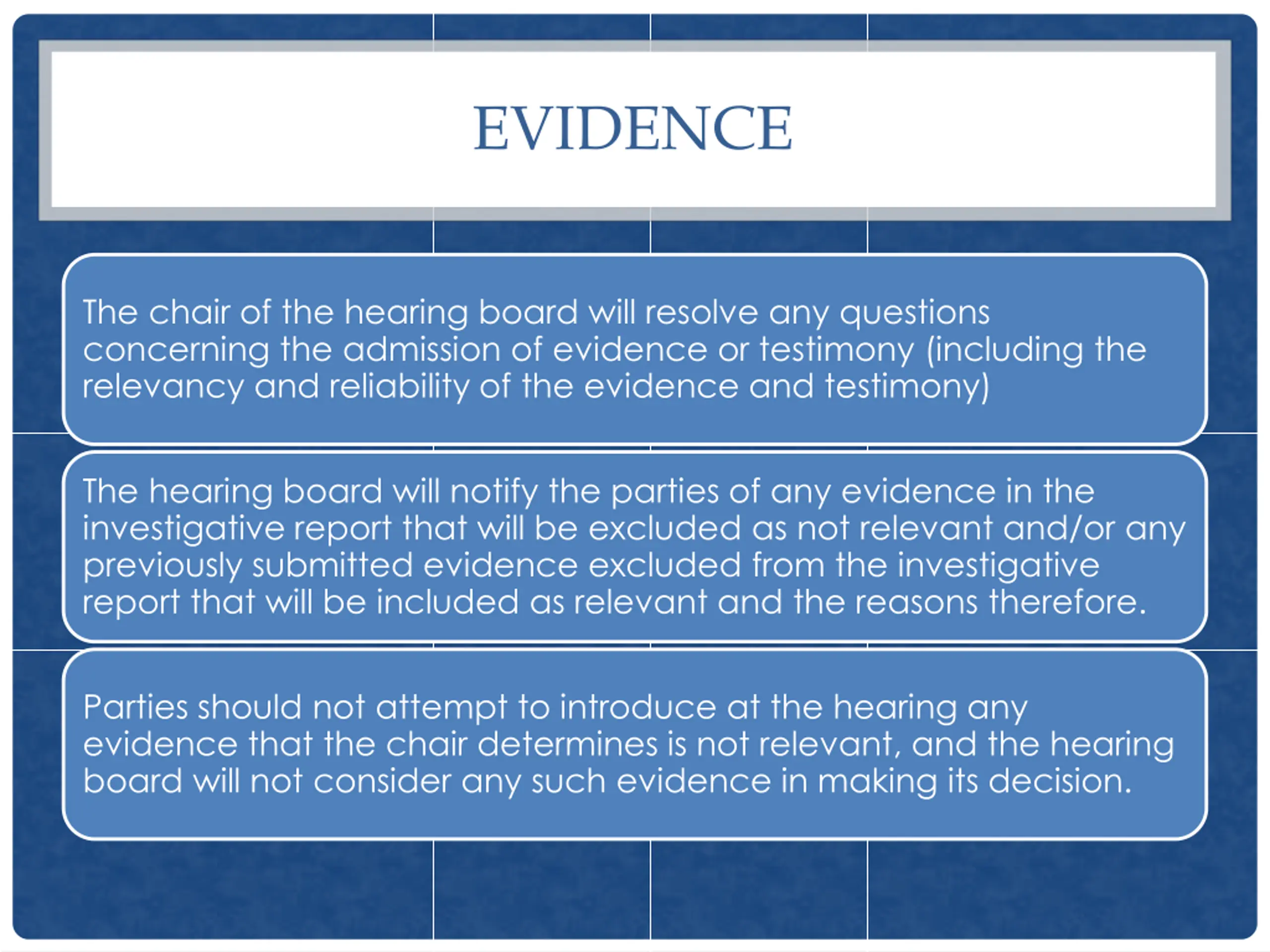 EVIDENCE The chair of the hearing board will resolve any questions concerning the admission of evidence or testimony (including the relevancy and reliability of the evidence and testimony) The hearing board will notify the parties of any evidence in the investigative report that will be excluded as not relevant and/or any previously submitted evidence excluded from the investigative report that will be included as relevant and the reasons therefore. Parties should not attempt to introduce at the hearing any evidence that the chair determines is not relevant, and the hearing board will not consider any such evidence in making its decision.