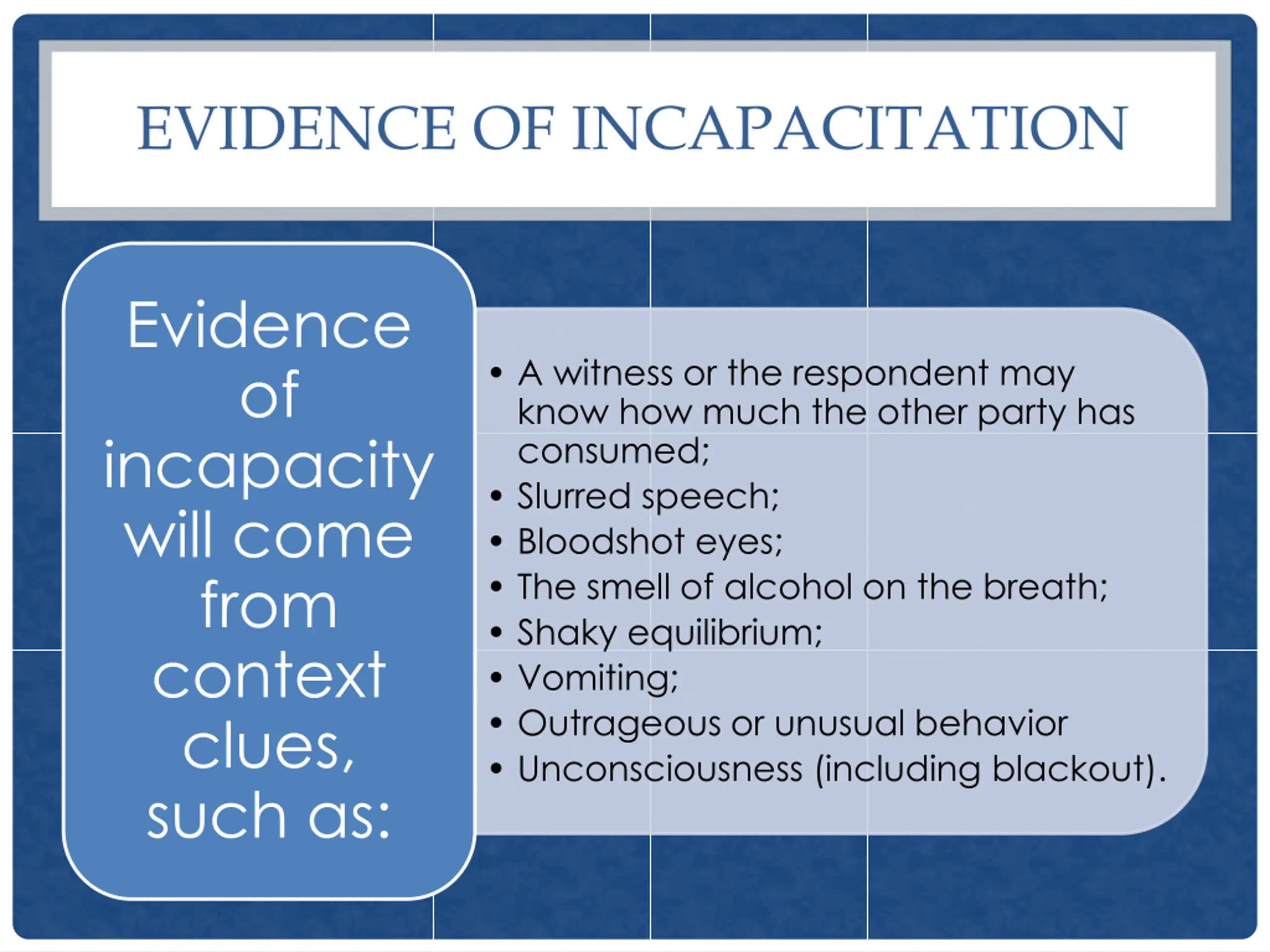 EVIDENCE OF INCAPACITATION Evidence of incapacity will come from context clues, such as: A witness or the respondent may know how much the other party has consumed; Slurred speech; Bloodshot eyes; The smell of alcohol on the breath; Shaky equilibrium; Vomiting; Outrageous or unusual behavior Unconsciousness (including blackout).