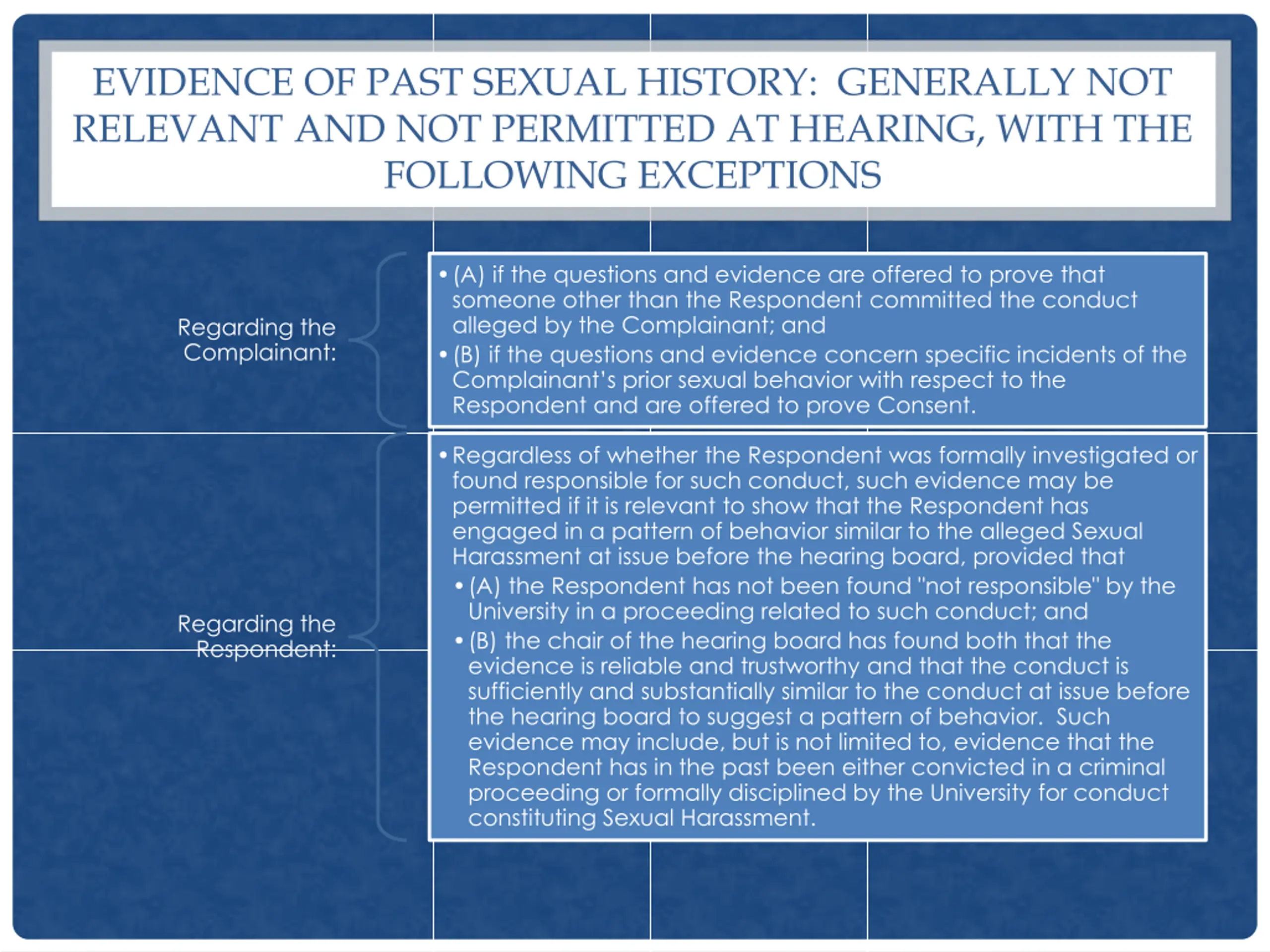 EVIDENCE OF PAST SEXUAL HISTORY: GENERALLY NOT RELEVANT AND NOT PERMITTED AT HEARING, WITH THE FOLLOWING EXCEPTIONS (A) if the questions and evidence are offered to prove that someone other than the Respondent committed the conduct alleged by the Complainant; and (B) if the questions and evidence concern specific incidents of the Complainant s prior sexual behavior with respect to the Respondent and are offered to prove Consent. Regarding the Complainant: Regardless of whether the Respondent was formally investigated or found responsible for such conduct, such evidence may be permitted if it is relevant to show that the Respondent has engaged in a pattern of behavior similar to the alleged Sexual Harassment at issue before the hearing board, provided that (A) the Respondent has not been found "not responsible" by the University in a proceeding related to such conduct; and (B) the chair of the hearing board has found both that the evidence is reliable and trustworthy and that the conduct is sufficiently and substantially similar to the conduct at issue before the hearing board to suggest a pattern of behavior. Such evidence may include, but is not limited to, evidence that the Respondent has in the past been either convicted in a criminal proceeding or formally disciplined by the University for conduct constituting Sexual Harassment. Regarding the Respondent: