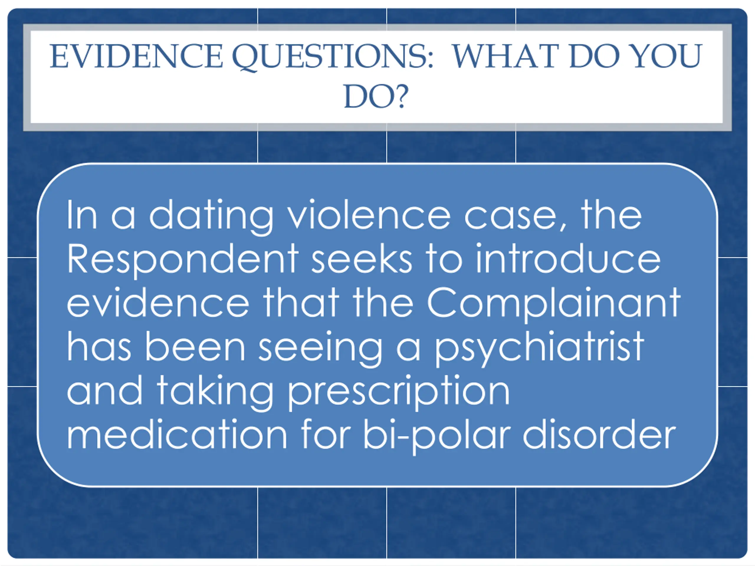 EVIDENCE QUESTIONS: WHAT DO YOU DO? In a dating violence case, the Respondent seeks to introduce evidence that the Complainant has been seeing a psychiatrist and taking prescription medication for bi-polar disorder