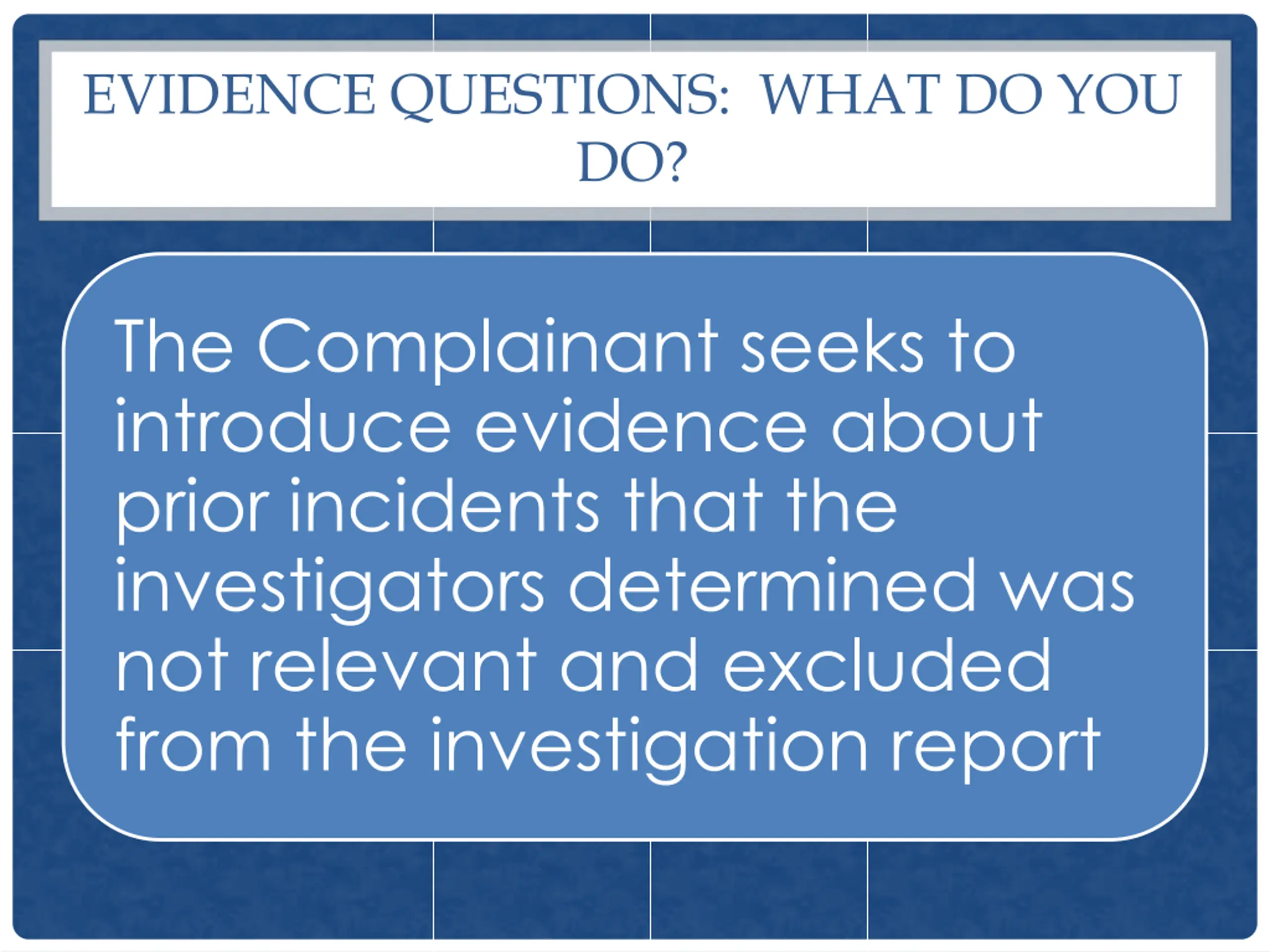 EVIDENCE QUESTIONS: WHAT DO YOU DO? The Complainant seeks to introduce evidence about prior incidents that the investigators determined was not relevant and excluded from the investigation report