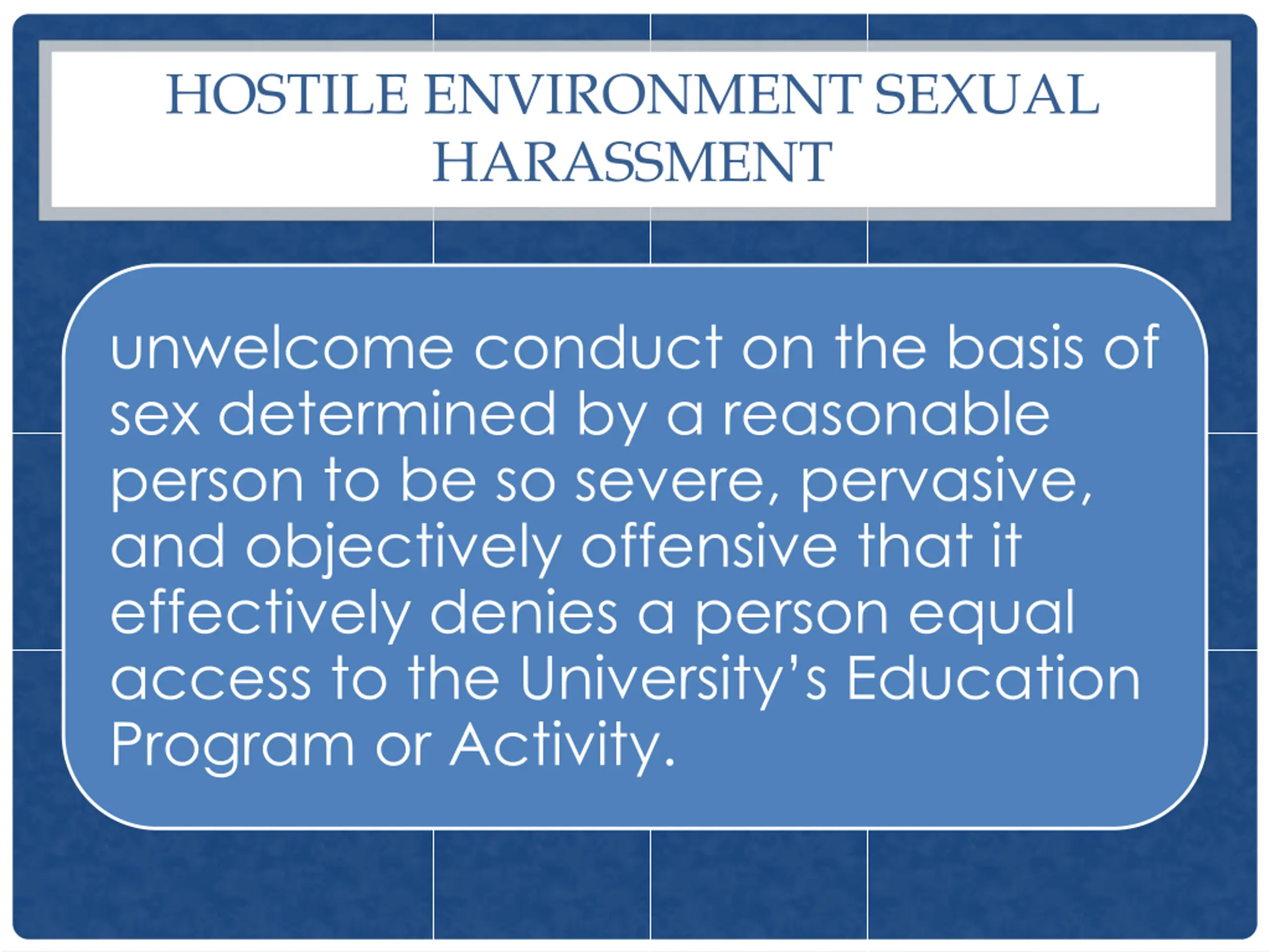 HOSTILE ENVIRONMENT SEXUAL HARASSMENT unwelcome conduct on the basis of sex determined by a reasonable person to be so severe, pervasive, and objectively offensive that it effectively denies a person equal access to the University s Education Program or Activity.