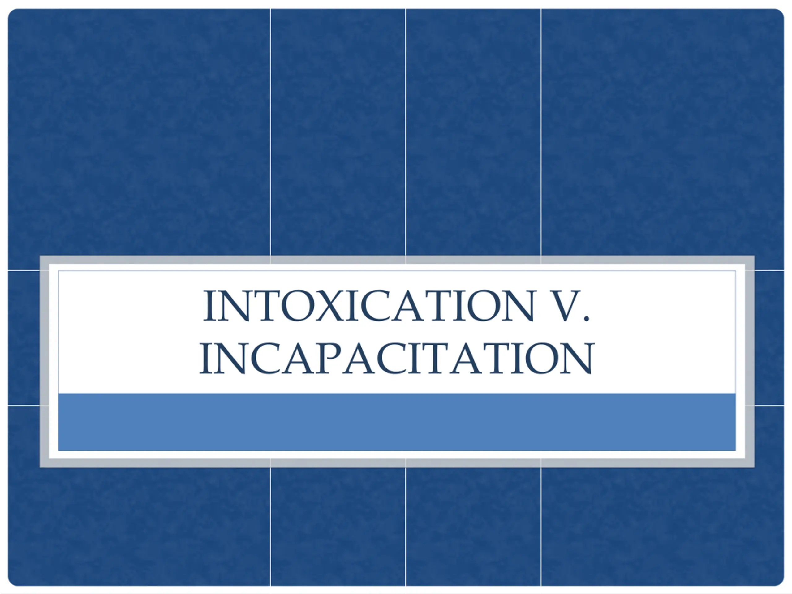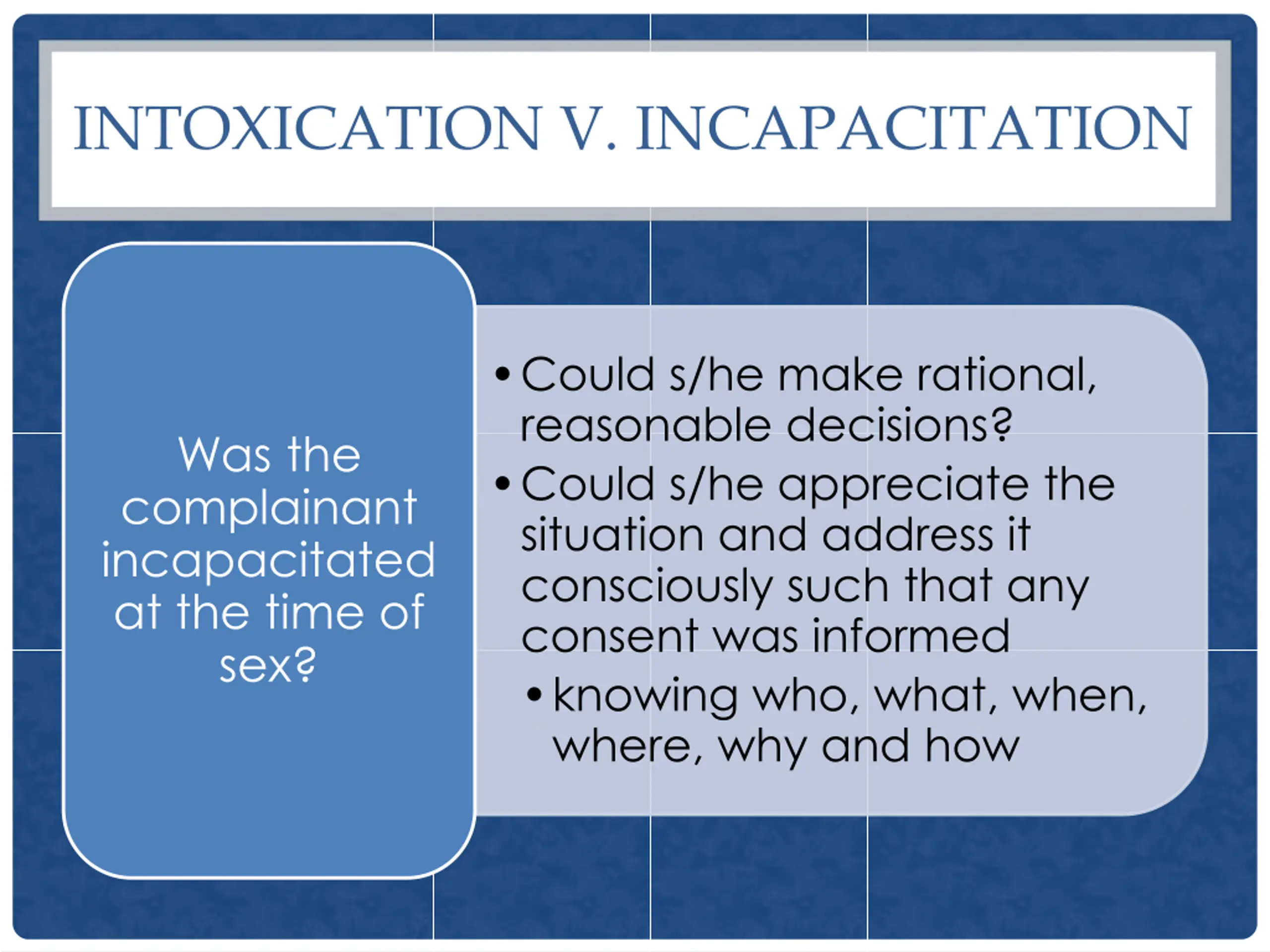 INTOXICATION V. INCAPACITATION Could s/he make rational, reasonable decisions? Could s/he appreciate the situation and address it consciously such that any consent was informed knowing who, what, when, where, why and how Was the complainant incapacitated at the time of sex?