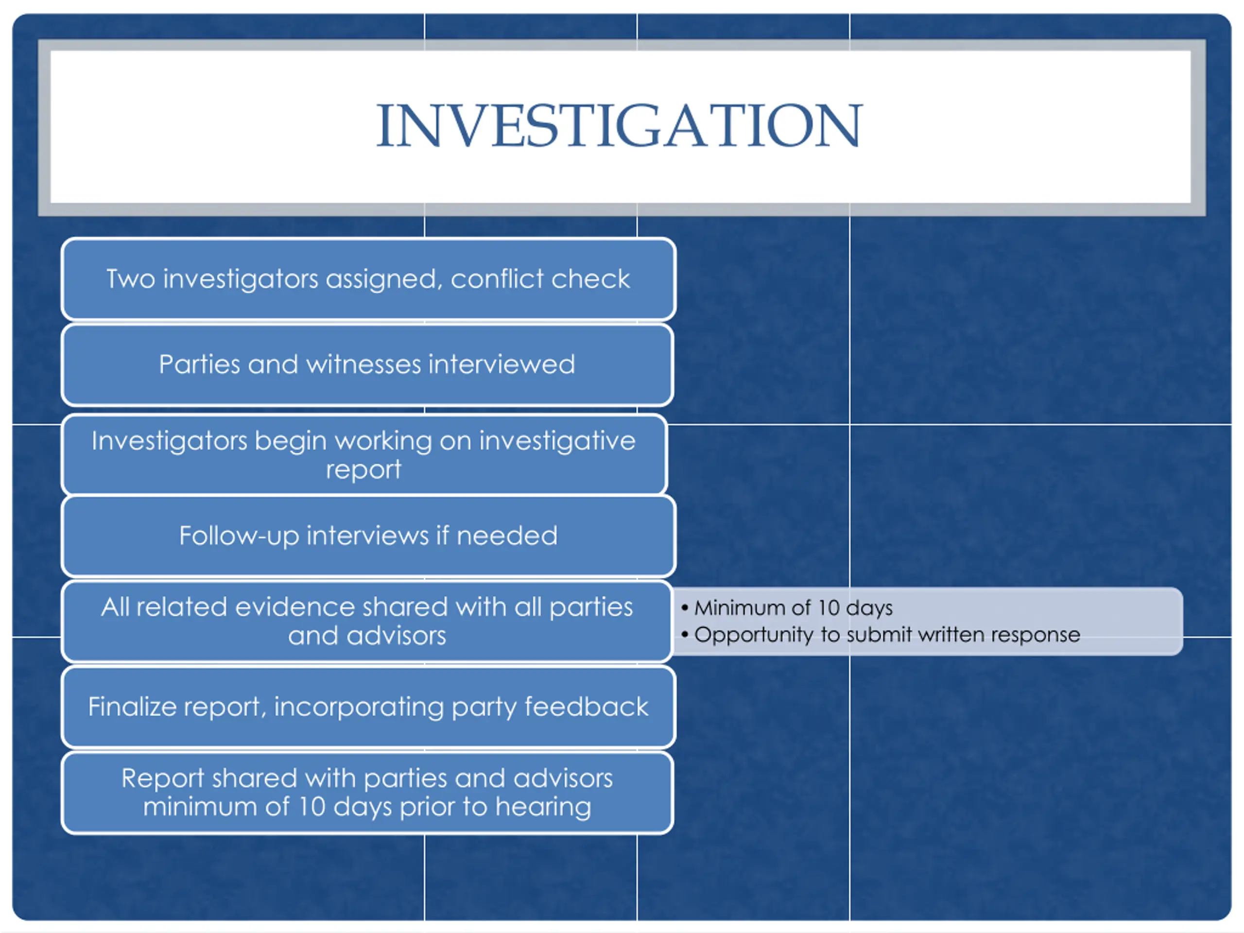 INVESTIGATION Two investigators assigned, conflict check Parties and witnesses interviewed Investigators begin working on investigative report Follow-up interviews if needed All related evidence shared with all parties and advisors Minimum of 10 days Opportunity to submit written response Finalize report, incorporating party feedback Report shared with parties and advisors minimum of 10 days prior to hearing
